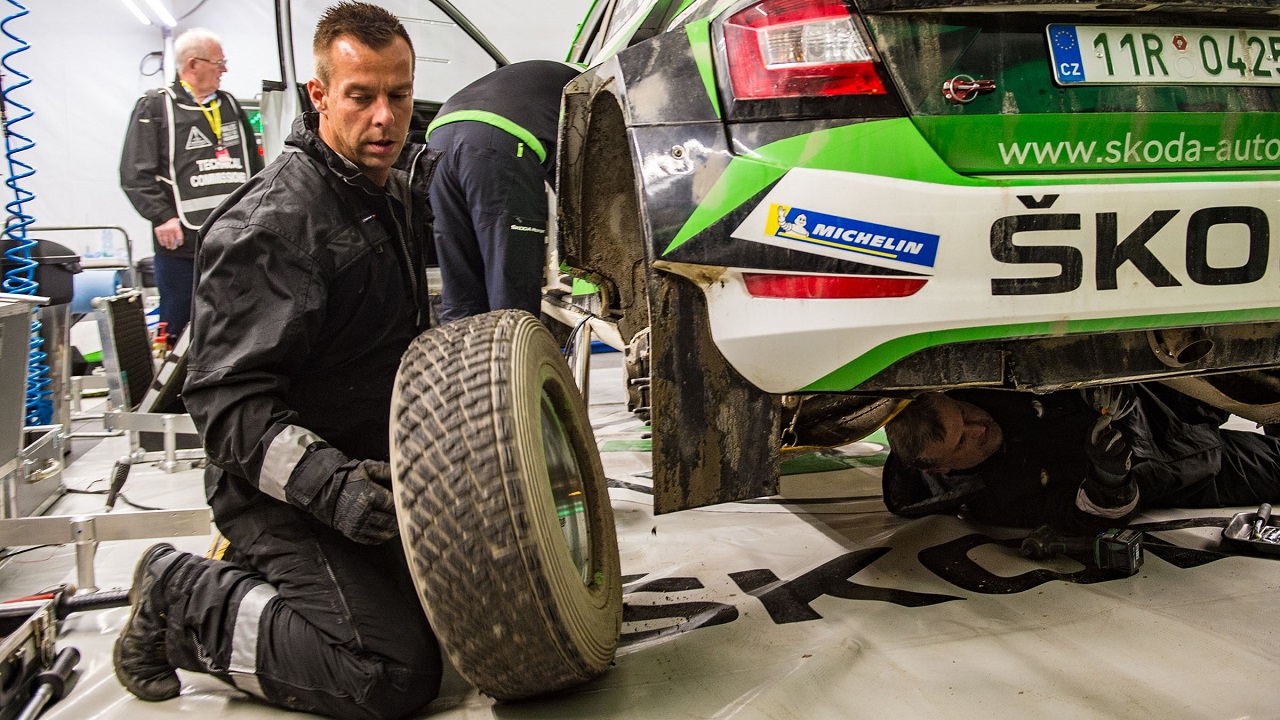 Περνάμε στη φάση της αντικατάστασης του ελαστικού. Πρόκειται για μία «χορογραφία», όπου οδηγός και συνοδηγός συνεργάζονται για να ολοκληρωθεί η διαδικασία ταχύτητα. Περίπου ένα, το πολύ ενάμιση λεπτό αρκεί ώστε να γίνει η αντικατάσταση σε ασφαλές σημείο της πίστα. Κάπου εδώ αξίζει να τονίσουμε ότι το πλήρωμα απαγορεύεται να ξεκινήσει χωρίς να δεθούν οι ζώνες και να συνδεθεί το βύσμα επικοινωνίας στο κράνος. Τα πληρώματα της Skoda Motorsport κάνουν δοκιμές για την αλλαγή των ελαστικών πριν από κάθε ράλι.