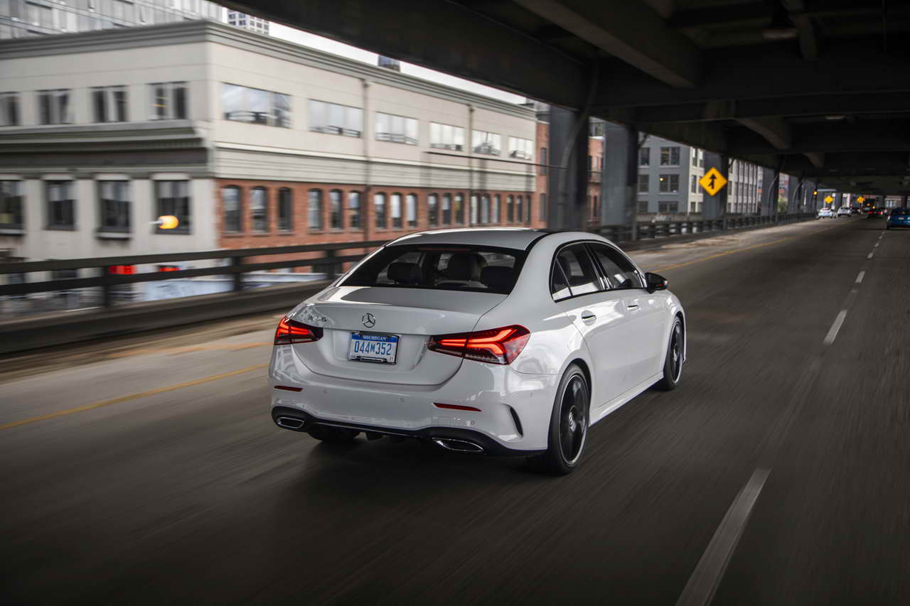 Όσον αφορά στην εμφάνιση, η κύρια διαφορά μεταξύ A-Class Hatchback και Sedan εντοπίζεται προφανώς, στο πίσω μέρος. Η ουρά της έκδοσης sedan, προσφέρει ξεχωριστή αίσθηση στο αυτοκίνητο, αν και το μεταξόνιο των 2,729 μέτρων προσδιορίζει τον compact χαρακτήρα του. Σημαντική δουλειά έχει γίνει και στον τομέα της αεροδυναμικής, καθώς η A-Class Sedan έχει απόδοση Cd 0,19, που όπως τονίζει η μάρκα συνιστά παγκόσμιο ρεκόρ για όχημα παραγωγής. Μάλιστα, το προηγούμενο ρεκόρ κατείχε επίσης ένα όχημα με έμβλημα το αστέρι, η Mercedes CLA Coupe.