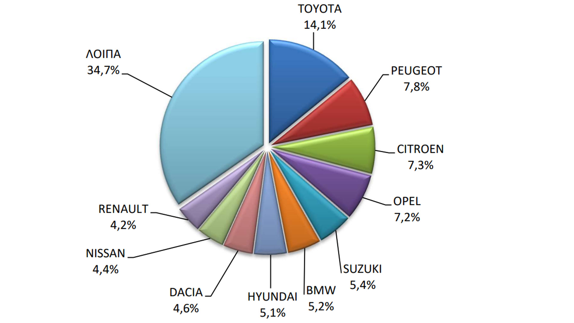 Μέσα στο πρώτο τρίμηνο του 2026, η Toyota βρέθηκε στην κορυφή με εντυπωσιακή διαφορά από τις υπόλοιπες μάρκες. Συγκεκριμένα, η ιαπωνική εταιρεία κάλυψε το 14,1% της ελληνικής αγοράς. Πίσω της ακολούθησε η Peugeot με μερίδιο 7,8% και η τριάδα ολοκληρώθηκε με την Citroen (μερίδιο αγοράς 7,3%). Πιο κάτω μπορείτε να δείτε τον επίσημο πίνακα της ΕΛ.ΣΤΑΤ., όπου παρουσιάζονται σε γράφημα οι δέκα δημοφιλέστερες μάρκες στην Ελλάδα για το πρώτο τρίμηνο.