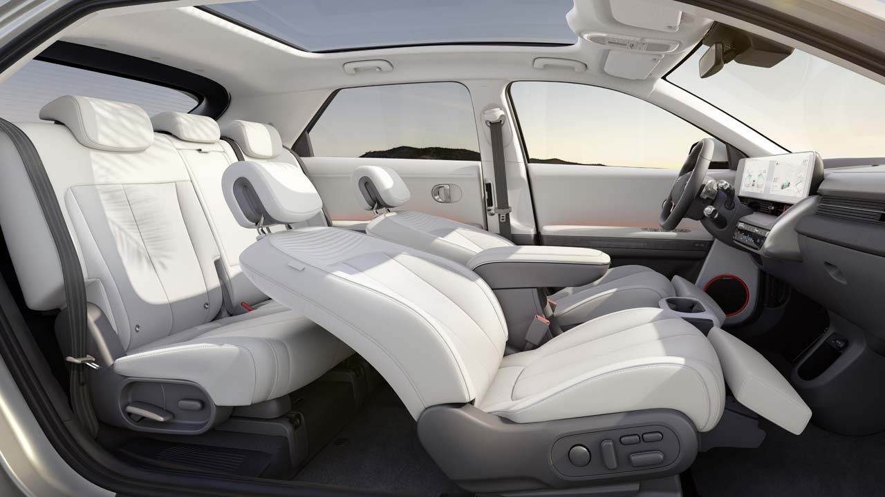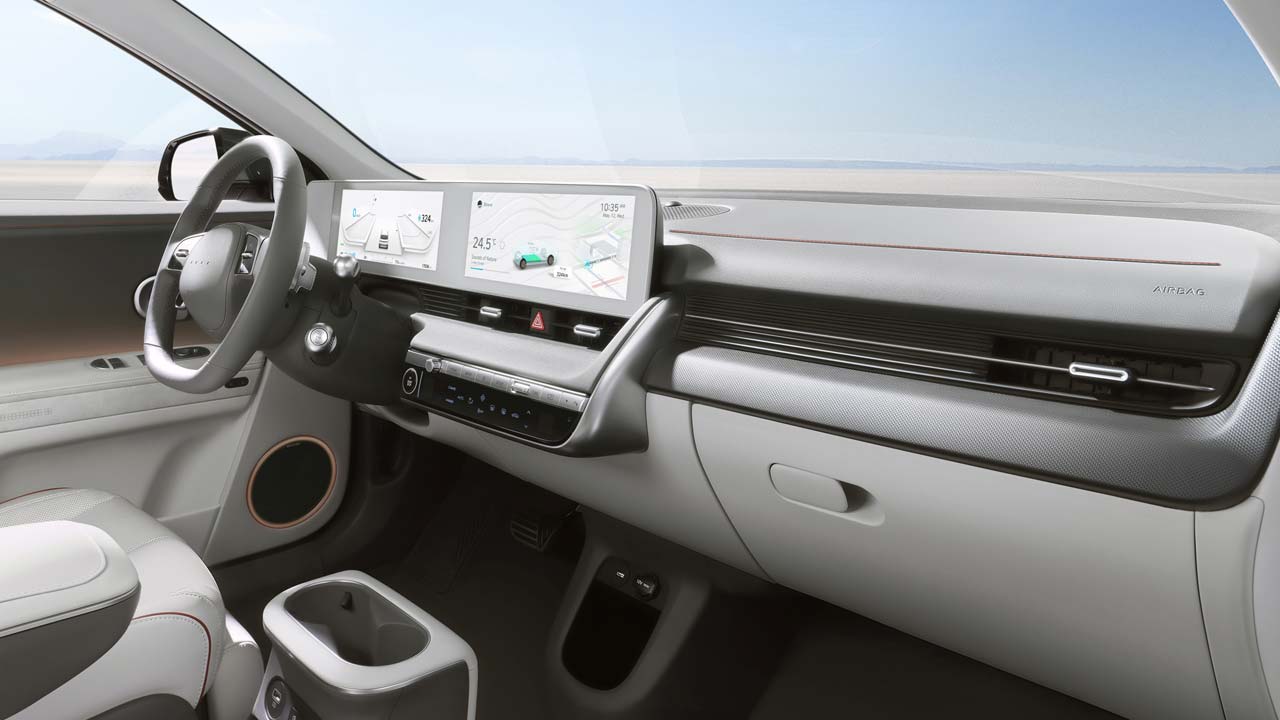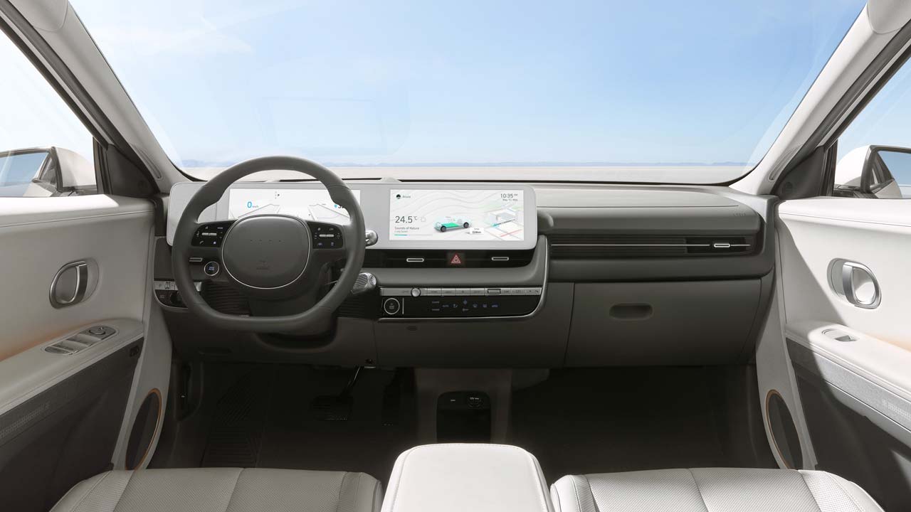 Στο εσωτερικό η σχεδίαση στηρίζεται σε απλές, “καθαρές” γραμμές. Η κεντρική κονσόλα απουσιάζει και αφήνει κενό χώρο ανάμεσα σε οδηγό/συνοδηγό, ενώ η Hyundai υπόσχεται κορυφαία ποιότητα υλικών. Δύο οθόνες 12 ιντσώνα αναλαμβάνουν την πληροφόρηση και ψυχαγωγία οδηγού και επιβατών, ενώ υπάρχουν αρκετές πρακτικές λύσεις για αποθήκευση αντικειμένων. Το πορτμπαγκάζ είναι στα 531 λίτρα (υπάρχει αποθηκευτικός χώρος και κάτω από το εμπρός καπό 57 ή 24 λίτρα στην δικίνητη και τετρακίνητη έκδοση αντίστοιχα), ενώ με την αναδίπλωση των καθισμάτων φτάνει στα 1.591 λίτρα.