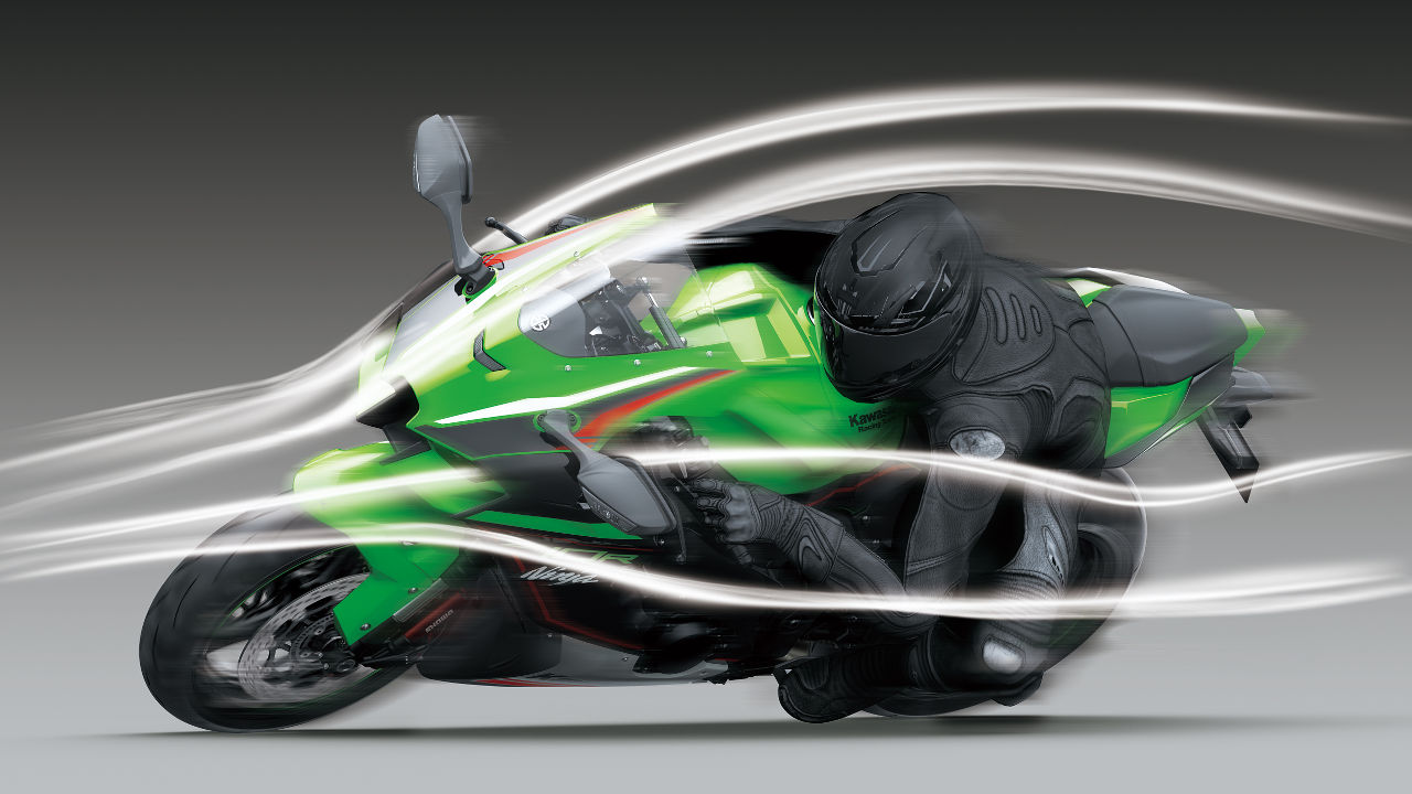 Οι Ιάπωνες σχεδίασαν με τέτοιο τρόπο το φέρινγκ ώστε να μην χρειαστεί να προσθέσουν αεροτομές στο ρύγχος όπως κάνουν άλλοι κατασκευαστές και τις ενσωμάτωσαν στη σχεδίαση του. Σύμφωνα με την έρευνα τους αυτή η σχεδιαστική προσέγγιση προσφέρει 17% περισσότερη κάθετη δύναμη έναντι των πρόσθετων winglets. Αποτέλεσμα είναι η καλύτερη αξιοποίηση του εμπρός ελαστικού που πιέζεται πιο αποδοτικά στο οδόστρωμα, άρα προσφέρει και περισσότερη πρόσφυση στις υψηλές ταχύτητες αλλά και καλύτερη πληροφόρηση. Η ζελατίνα έχει ψηλώσει κατά 40 χλστ. για την καλύτερη προστασία του αναβάτη ενώ ανασχεδιασμένη είναι και η ουρά ώστε να βελτιωθεί συνολικά το αεροδυναμικό πακέτο της πράσινης βασίλισσας των superbikes.
