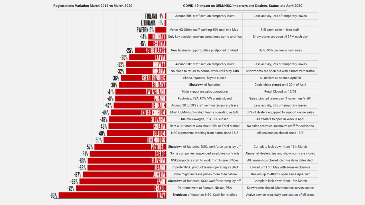 Ωστόσο, ο αντίκτυπος της πανδημίας στην Ευρώπη των 27 δεν ήταν ο ίδιος για όλες τις χώρες. Σύμφωνα με την JATO, στη Φινλανδία και τη Λιθουανία η πτώση ήταν οριακή, μόλις μια ποσοστιαία μονάδα (-1%), ενώ στη Σουηδία οι ταξινομήσεις κατέγραψαν πτώση 9%., η τρίτη μικρότερη πτώση στην Ευρώπη. Να σημειωθεί πως σε Φινλανδία και Σουηδία τα μέτρα αποστασιοποίησης δεν ήταν υποχρεωτικά με τις κυβερνήσεις να ακολουθούν τη “συνταγή” των συστάσεων και τις επιχειρήσεις να παραμένουν ανοιχτές. Στη Λιθουανία το κοινό μπορούσε να προβεί σε αγορά αυτοκινήτου απομακρυσμένα με την παράδοση του μοντέλου να πραγματοποιείται εντός 3-7 εργάσιμων ημερών.