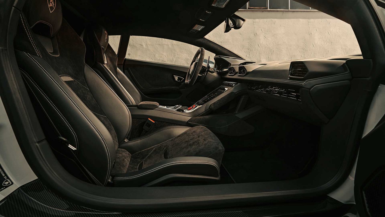 Επιπλέον, η συγκεκριμένη Lamborghini Huracan Evo έχει μειωμένη απόσταση από το έδαφος κατά 3,5 εκ. λόγω της τοποθέτησης νέων ελατηρίων. Στο εσωτερικό, οι περισσότερες επιφάνειες καλύπτονται με δέρμα τύπου alcantara, με τον ιδιοκτήτη να επιλέγει το χρώμα της αρεσκείας του.