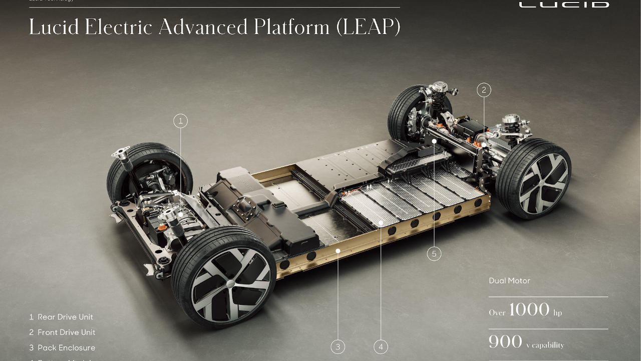 Η πλατφόρμα που βασίζεται το Air ονομάζεται Lucid Electric Advanced Platform (LEAP) και πάνω σε αυτή θα χτιστούν και άλλα οχήματα που θα δούμε από τους Αμερικάνους στο μέλλον. Αυτή η ευέλικτη πλατφόρμα επέτρεψε εξαιρετική εκμετάλλευση χώρων με τη Lucid να αναφέρει ότι το Air έχει τον μεγαλύτερο αποθηκευτικό χώρο κάτω από το καπό του -όχι το πορτμπαγκάζ- ανάμεσα στα ηλεκτρικά αλλά και την κορυφαία αεροδυναμική απόδοση ανάμεσα στα πολυτελή αυτοκίνητα με συντελεστή οπισθέλκουσας μόλις 0,21.