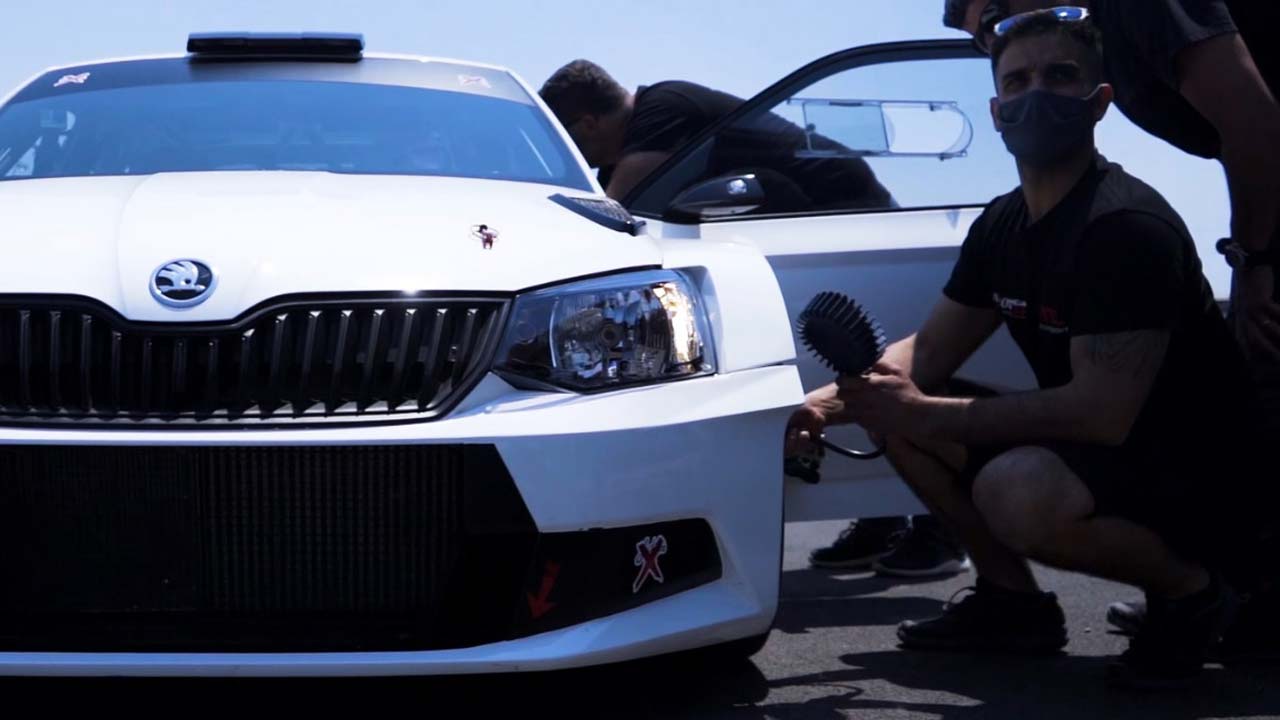 Φτάνοντας στην πίστα των Μεγάρων κάτω από την τέντα ήταν σηκωμένο στα τρίποδα το Skoda Fabia R5 και όπως συνηθίζω πάντα, άρχισα να το επεξεργάζομαι από κάτω γονατίζοντας στην άσφαλτο. Στη συνέχεια ήρθε η σειρά της καμπίνας, του κινητήρα αλλά και κάθε λεπτομέρεια από τη στήριξη του γρύλου ή του ηλεκτρόκλειδου για την αλλαγή στα λάστιχα.