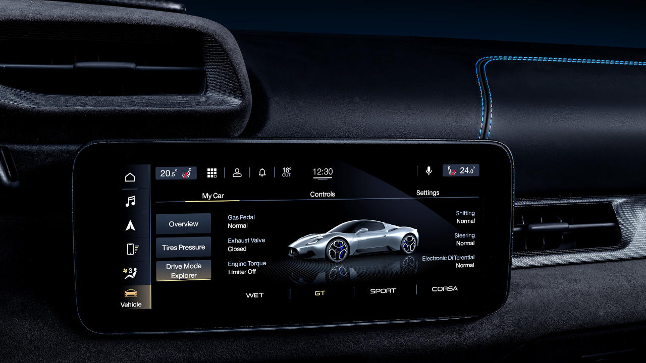 Η Maserati MC20 φέρει πέντε συνολικά προγράμματα οδήγησης που αλλάζουν τη λειτουργία των ηλεκτρονικών της αλλά και τον τρόπο που αποδίδει ο κινητήρας, τα GT, Wet, Sport, Corsa και το ESC Off. Στο τελευταίο πρόγραμμα απενεργοποιούνται τα συστήματα που υποβοηθούν τον οδηγό.