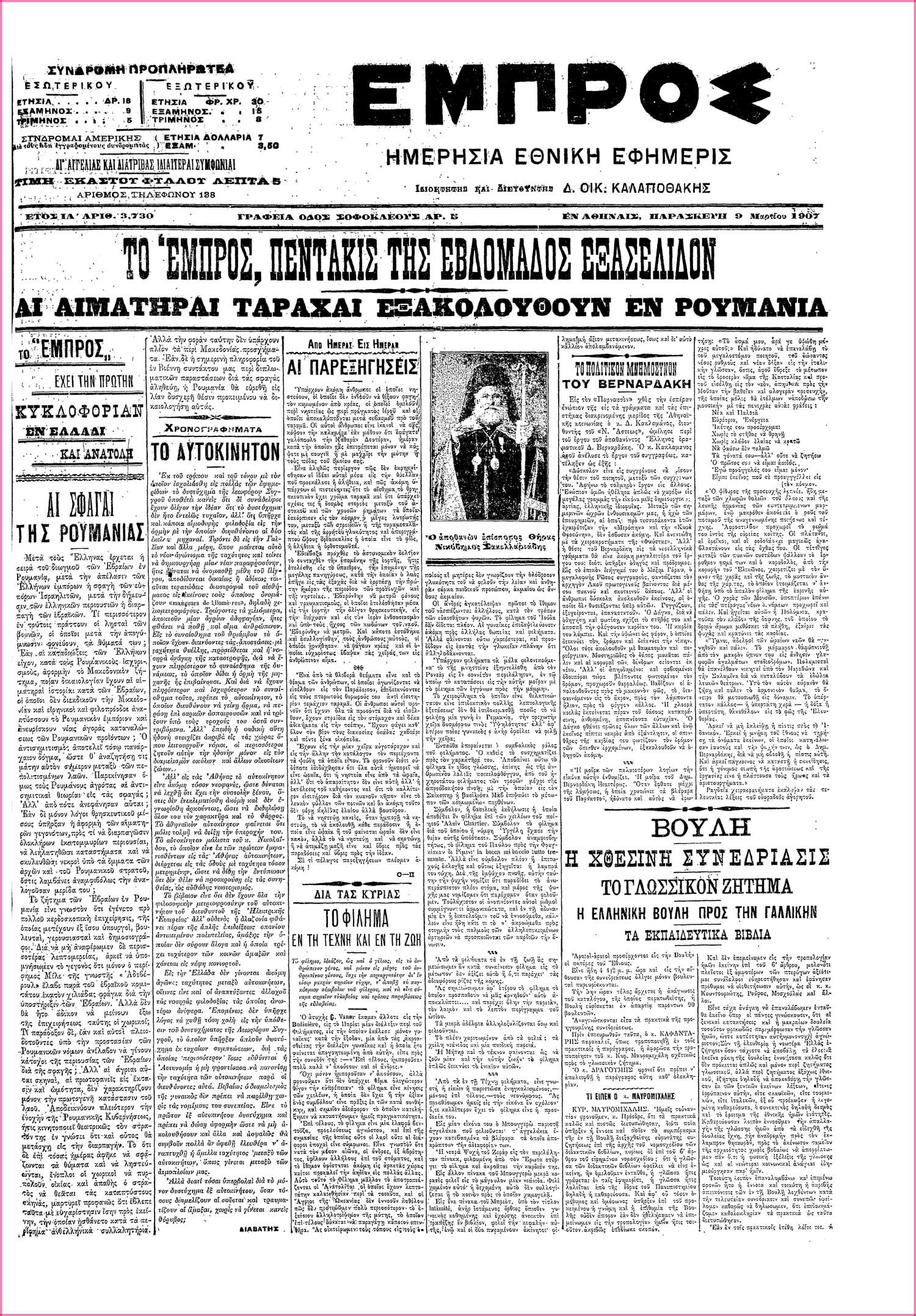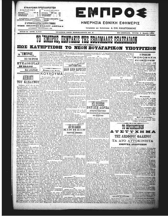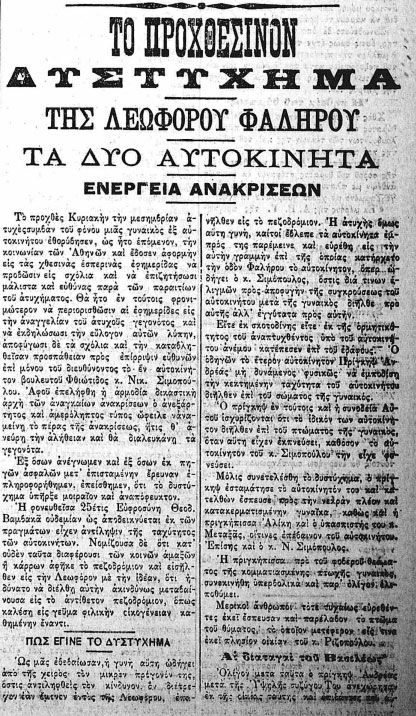 Το 1907, στην Αθήνα κυκλοφορούν μόλις 7 αυτοκίνητα, γεγονός που καθιστούσε αχρείαστες τις πινακίδες κυκλοφορίας, καθώς όλοι γνώριζαν τους κατόχους και οδηγούς τους. Και όμως στην Αθήνα των επτά αυτοκινήτων, αρκούσε η συνάντηση μόλις δύο εξ’ αυτών στην οδό Φαλήρου (σ.σ. Συγγρού) για να προκληθεί το πρώτο θανατηφόρο τροχαίο στην δυστυχώς πλούσια ιστορία της χώρας μας σε αυτό τον τομέα…