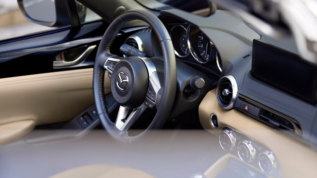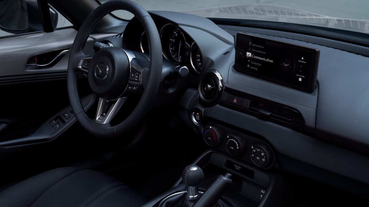 Οι αλλαγές συνεχίζονται και στην καμπίνα του MX-5 που φέρει πλέον νέα μεγαλύτερη κεντρική οθόνη 8,8 ιντσών με το σύστημα πολυμέσων να επιτρέπει την ασύρματη συνδεση Android Auto και Apple CarPlay, ενώ πλέον μπορείτε να συνδέσετε το κινητό σας και μέσω θύρας USB-C.