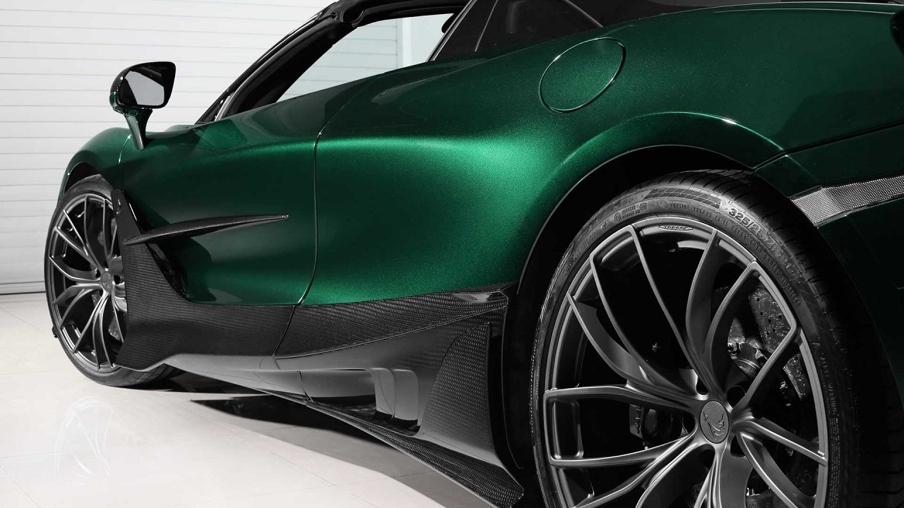 Στο πλαϊνό τμήμα, οι ποδιές είναι κατασκευασμένες επίσης από carbon, ενώ στο πίσω μέρος υπάρχει ο διαχύτης και η αεροτομή με δύο πτερύγια. Οι ζάντες είναι μεγέθους 20 ιντσών εμπρός και 21 πίσω, με ελαστικά διαστάσεων 225/30 και 325/25 αντίστοιχα.