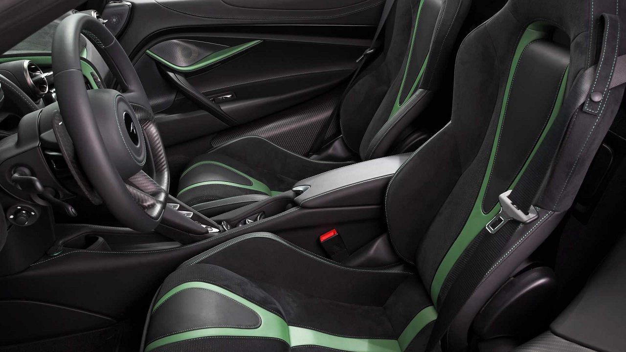 Παρόμοιο σκηνικό επικρατεί και στο εσωτερικό της McLaren 720S Spider. Σε αρκετά σημεία υπάρχουν carbon επιφάνειες και συνδυάζονται με alcantara. Ενδεικτικά, τα καθίσματα και οι επενδύσεις των θυρών διακοσμούνται με λεπτό δέρμα τύπου alcantara.