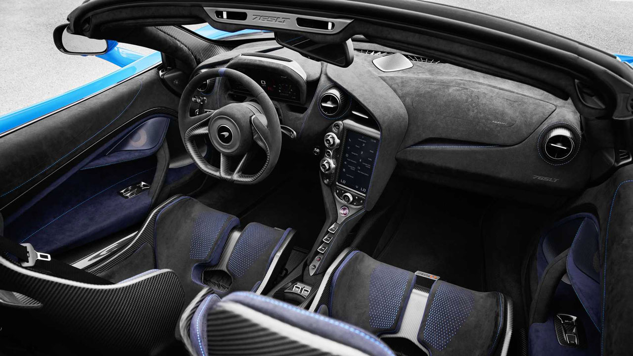 Ιδιαίτερο ενδιαφέρον έχει και η ηλεκτρικά ανοιγόμενη οροφή (11 δλ. για το άνοιγμα), η οποία έχει κατασκευαστεί από ανθρακονήματα ώστε αφενός να διατηρήσει χαμηλά το κέντρο βάρους και αφετέρου να μην αυξήσει το συνολικό βάρος. Κάτι τέτοιο επιτρέπει στην McLaren 765LT Spider να αυξήσει το βάρος της κατά μόλις 49 κιλά συγκριτικά με το coupe, επίδοση που είναι ιδιαίτερα εντυπωσιακή.