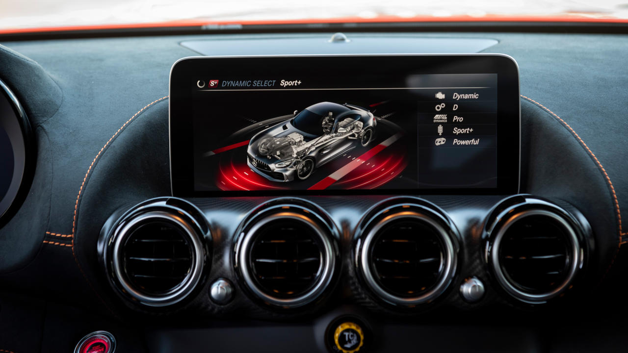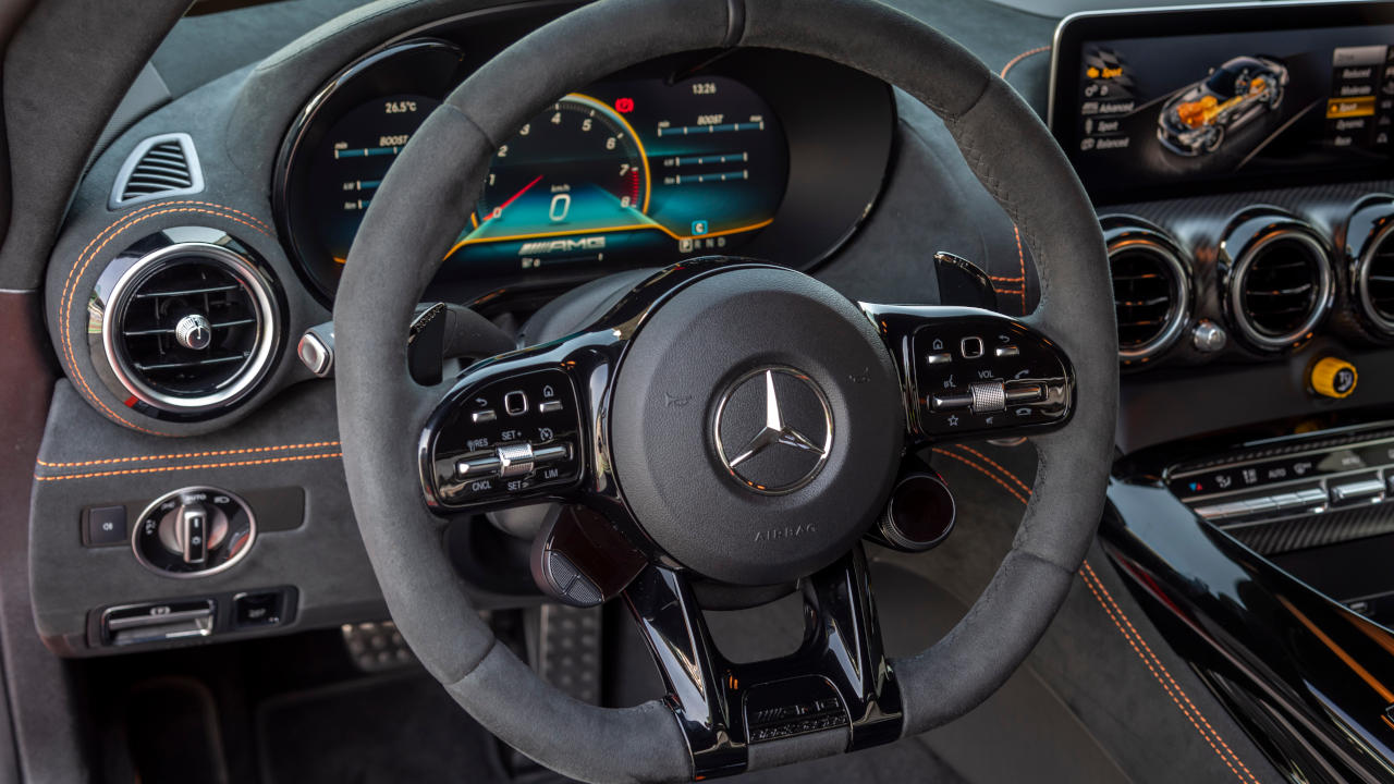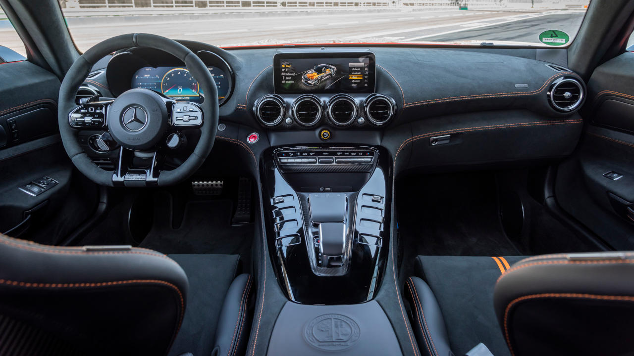 Πολεμική είναι και η ατμόσφαιρα που επικρατεί και στο εσωτερικό του πανίσχυρου coupe με το δέρμα Nappa και το ύφασμα Dinamica από μικρο-ίνες να κυριαρχούν ως επένδυση και τις πορτοκαλί ραφές και λεπτομέρειες να δημιουργούν μια όμορφη αντίθεση. Το άλλο στοιχείο που κάνει αισθητή την παρουσία του και εδώ είναι το ανθρακόνημα από το οποίο έχουν κατασκευαστεί και τα bucket καθίσματα, ειδικά για την GT Black Series. Άλλες αλλαγές αφορούν στο τιμόνι AMG GT, αλλά και στα αποκλειστικά γραφικά τόσο για τον πίνακα των πληροφοριών του οδηγού όσο και της κεντρικής οθόνης αφής του συστήματος πολυμέσων. Φαίνονται ακόμη πιο έντονα στην ρύθμιση “Supersport” που παρουσιάζει παράλληλα επιπλέον πληροφορίες σχετικές με την οδήγηση.