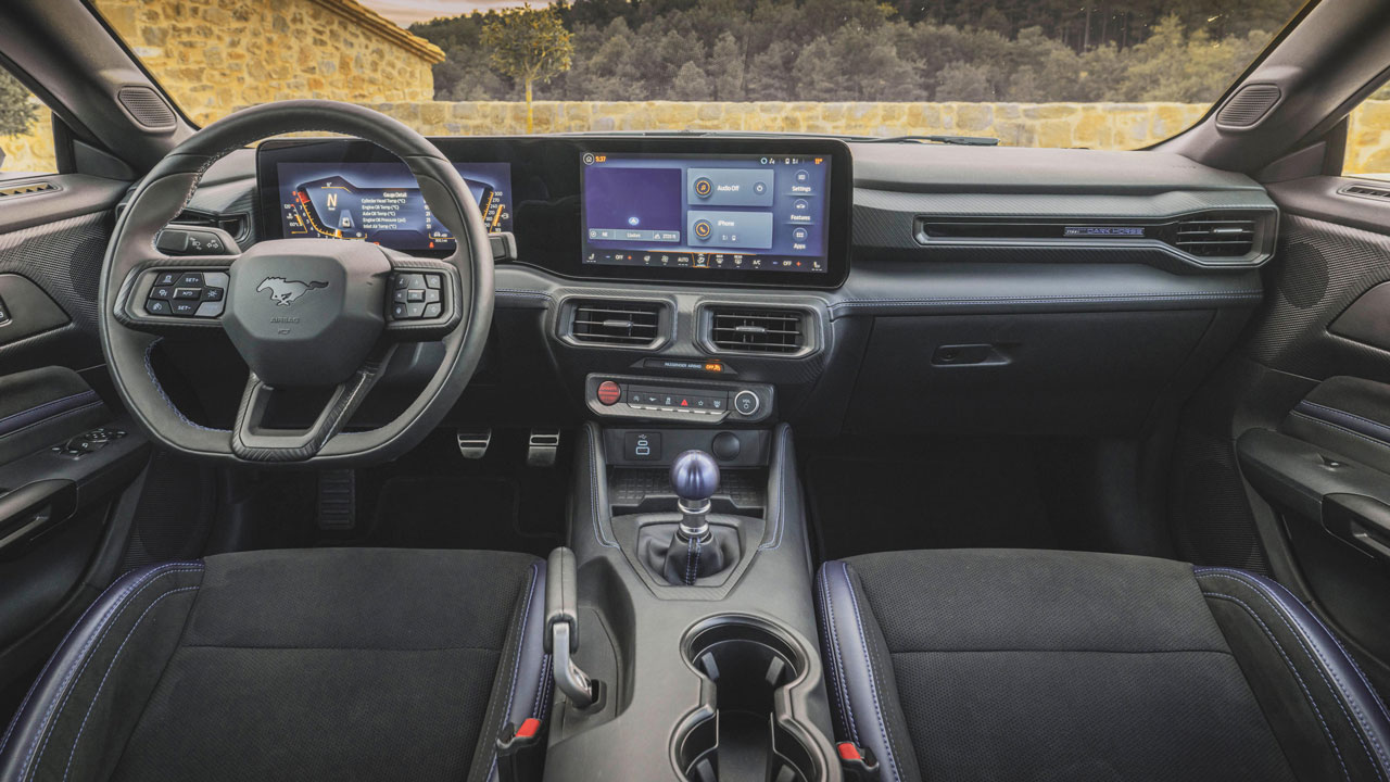 Περνώντας στο εσωτερικό, το κλίμα είναι “πολεμικό”, μιας και συναντάμε στοιχεία όπως τα recaro καθίσματα, το flat-buttomed τιμόνι και τα αλουμινένια πεντάλ. Η καμπίνα είναι επίσης τεχνολογικά προηγμένη, με δύο οθόνες στο ταμπλό. Η μία βρίσκεται πίσω από το τιμόνι και το μέγεθός της αγγίζει τις 12,4 ίντσες (μπορεί να διαμορφωθεί ώστε να απεικονίζει διαφορετικές διατάξεις ενδείξεων και προσαρμοζόμενα γραφικά, ανάλογα με το Drive Mode), ενώ ακριβώς δίπλα υπάρχει η οθόνη αφής για ενημέρωση και ψυχαγωγία μεγέθους 13,2 ιντσών με αισθητή γωνία προς τον οδηγό. Το πιο πρόσφατο σύστημα SYNC 4 της Ford μπορεί να ενσωματώσει smartphone χωρίς καλώδια, χρησιμοποιώντας ασύρματο Apple CarPlay και Android Auto. Για τους λάτρεις της οδήγησης σε πίστα, θύρες USB για τη σύνδεση καμερών ή συσκευών για την καταγραφή δεδομένων είναι έξυπνα τοποθετημένες πιο ψηλά από το σημείο του κεφαλιού των επιβατών, ώστε να μην κρέμονται καλώδια στο cockpit.