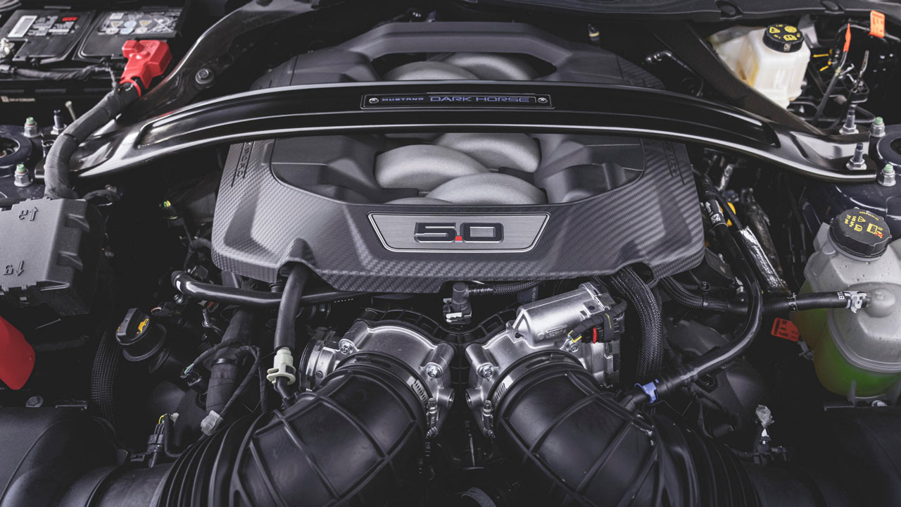Η νέα Ford Mustang εξοπλίζεται με νέο V8 κινητήρα 5,0 λίτρων που αποδίδει ισχύ 446 ίππους και ροπή 540 Nm (454 ίπποι και ροπή 540 Nm στην έκδοση Mustang Dark Horse με το χειροκίνητο κιβώτιο). Είναι εφοδιασμένος με νέο σύστημα εισαγωγής με διπλή εισαγωγή αέρα και δύο πεταλούδες γκαζιού, ενώ διαθέτει επίσης στροφαλοφόρο άξονα από σφυρήλατο χάλυβα με επίστρωση πολυμερούς για μειωμένη τριβή και αυξημένη αντοχή.
