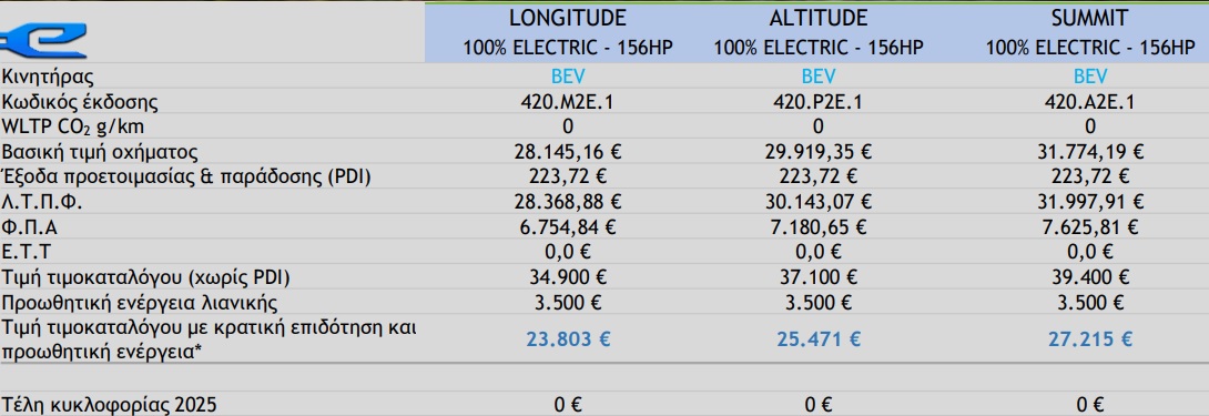 Ο τιμοκατάλογος της ηλεκτρικής έκδοσης επωφελείται από νέες προωθητικές ενέργειες. Έτσι, μετά την εφαρμογή τους η τιμή της εισαγωγικής έκδοσης είναι πλέον 31.400 ευρώ. Εάν δε, συνυπολογιστεί η κρατική επιδότηση του προγράμματος “Κινούμαι Ηλεκτρικά ΙΙΙ”, η τιμή πέφτει στα 23.800 ευρώ. Έχοντας όχι μόνο σημαντικά χαμηλότερο κόστος χρήσης και συντήρησης σε σχέση με τις θερμικές και υβριδικές εκδόσεις αλλά και χαμηλότερη τιμή, η ηλεκτρική αποτελεί μια ιδιαίτερα συμφέρουσα επιλογή στην γκάμα του μοντέλου.