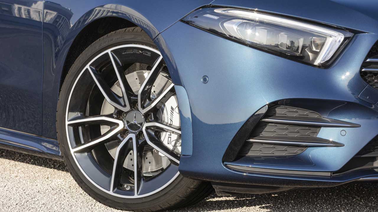 Το μεταξόνιο της Mercedes-AMG A 35 4MATIC Saloon είναι στα 2.729 χλστ. και σε συνδυασμό με τους κοντούς προβόλους εμπρός και πίσω, αλλά και τις γραμμές του αμαξώματος, συνθέτουν ένα άκρως δυναμικό σύνολο. Η μάσκα είναι σήμα κατατεθέν για μοντέλο της Mercedes-AMG, ενώ οι μεγάλες εισαγωγές αέρα στον εμπρός προφυλακτήρα, οι ζάντες αλουμινίου 18 ή 19 ιντσών και ο σχεδιασμός του πίσω προφυλακτήρα προϊδεάζουν για τις ικανότητές της.