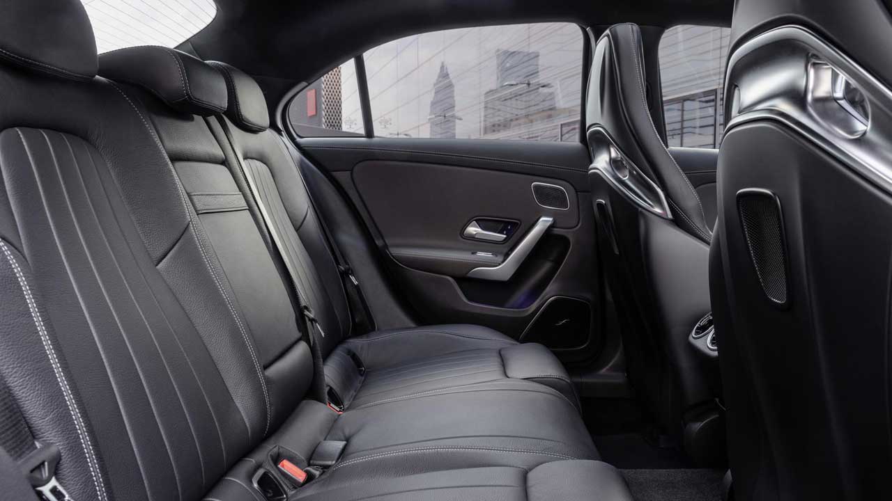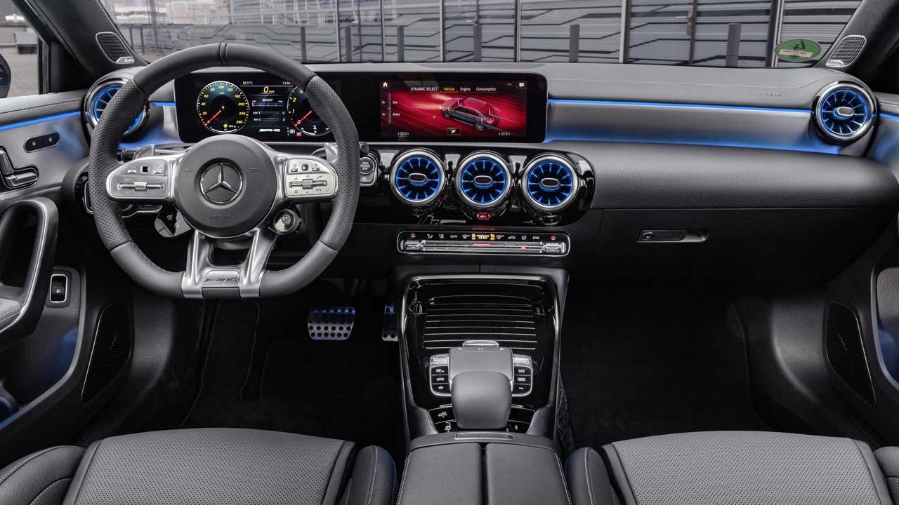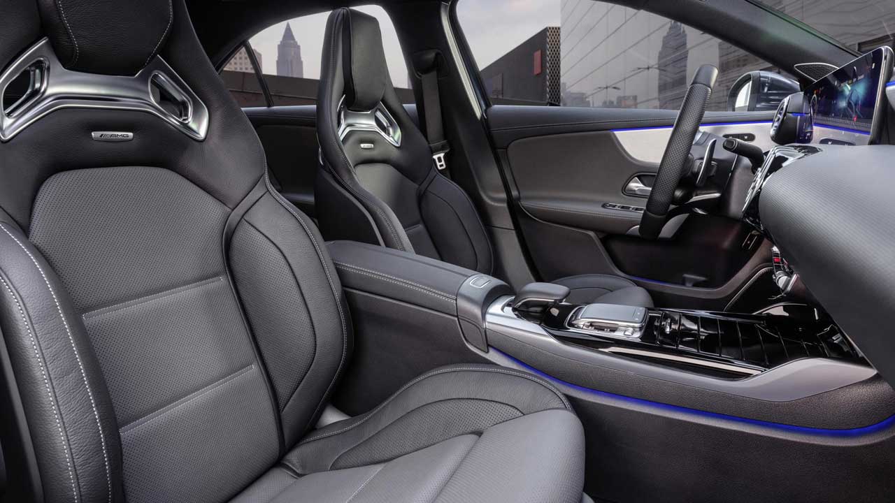 Στο εσωτερικό της, η Mercedes-AMG A 35 4MATIC Saloon έχει να επιδείξει φυσικά το νέο σύστημα πολυμέσων MBUX, όπερ σημαίνει δύο ψηφιακές οθόνες ενωμένες με ένα ενιαίο κρύσταλλο (μία για τον πίνακα οργάνων και μία στο κέντρο του ταμπλό) και αναγνώριση φωνητικών εντολών. Το τιμόνι είναι νέας γενιάς και έχει επίπεδο κάτω άκρο, ενώ είναι ντυμένο με διάτρητο δέρμα. Διαθέτει χειριστήρια με επιφάνεια αφής, ενώ πίσω του έχουν τοποθετηθεί τα paddles για την αλλαγή των ταχυτήτων στο κιβώτιο διπλού συμπλέκτη AMG SPEEDSHIFT DCT 7G. Τα καθίσματα είναι και αυτά ανασχεδιασμένα, δερμάτινα και με διχρωμία. Ο χώρος επιβατών παραμένει πολύ καλός για την κατηγορία, ενώ το πορτμπαγκάζ είναι στα 420 λίτρα και με μεγάλο άνοιγμα.