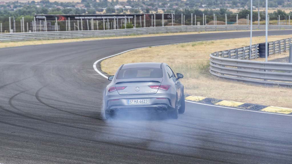 Το μεγαλύτερο μέρος της οδήγησης πραγματοποιήθηκε στην πίστα της Jarama, περίπου 25 χιλιόμετρα έξω από την Μαδρίτη. Από τα τέλη της δεκαετίας του ’60 έως το 1981 πραγματοποιούταν το Ισπανικό grand prix της F1. Το συνολικό μήκος της πίστας φτάνει τα 3.850 μέτρα και είναι αρκετά τεχνική με αρκετές κλειστές στροφές διαρκείας. Από τα πρώτα μέτρα αντιλαμβάνεσαι πως σε σχέση με την απερχόμενη Α 45 είναι αρκετά πιο διασκεδαστική καθώς απουσιάζει σε μεγάλο βαθμό η υποστροφή. H ρύθμιση Race ενδείκνυται για οδήγηση μέσα στην πίστα ενώ οι αλλαγές από το αυτόματο κιβώτιο των 8 σχέσεων πραγματοποιούνται άμεσα τόσο κατά το ανέβασμα όσο και κατά το κατέβασμα. Εντυπωσιακά και τα φρένα καθώς οι τεράστιοι, αεριζόμενοι δίσκοι σε συνδυασμό με τις 6-πίστονες δαγκάνες άντεξαν την καταπόνηση τις πίστας και τις ακραίες θερμοκρασίες που άγγιζαν τους 40ο C. Το πλαίσιο είναι πιο στιβαρό ενώ οι αναρτήσεις αντιδρούν ιδανικά ακόμα και στα «βίαια» περάσματα πάνω από τα kerb. Η νέα Α 45 καταφέρνει ταυτόχρονα να είναι αρκετά συμμετοχική και ευκολοδήγητη για τα δεδομένα της. Ενδιαφέρον στοιχείο η προσθήκη της τηλεμετρίας που αναλύει τα στοιχεία που συγκεντρώνει από την πίστα προσφέροντας χρήσιμες πληροφορίες στον οδηγό.