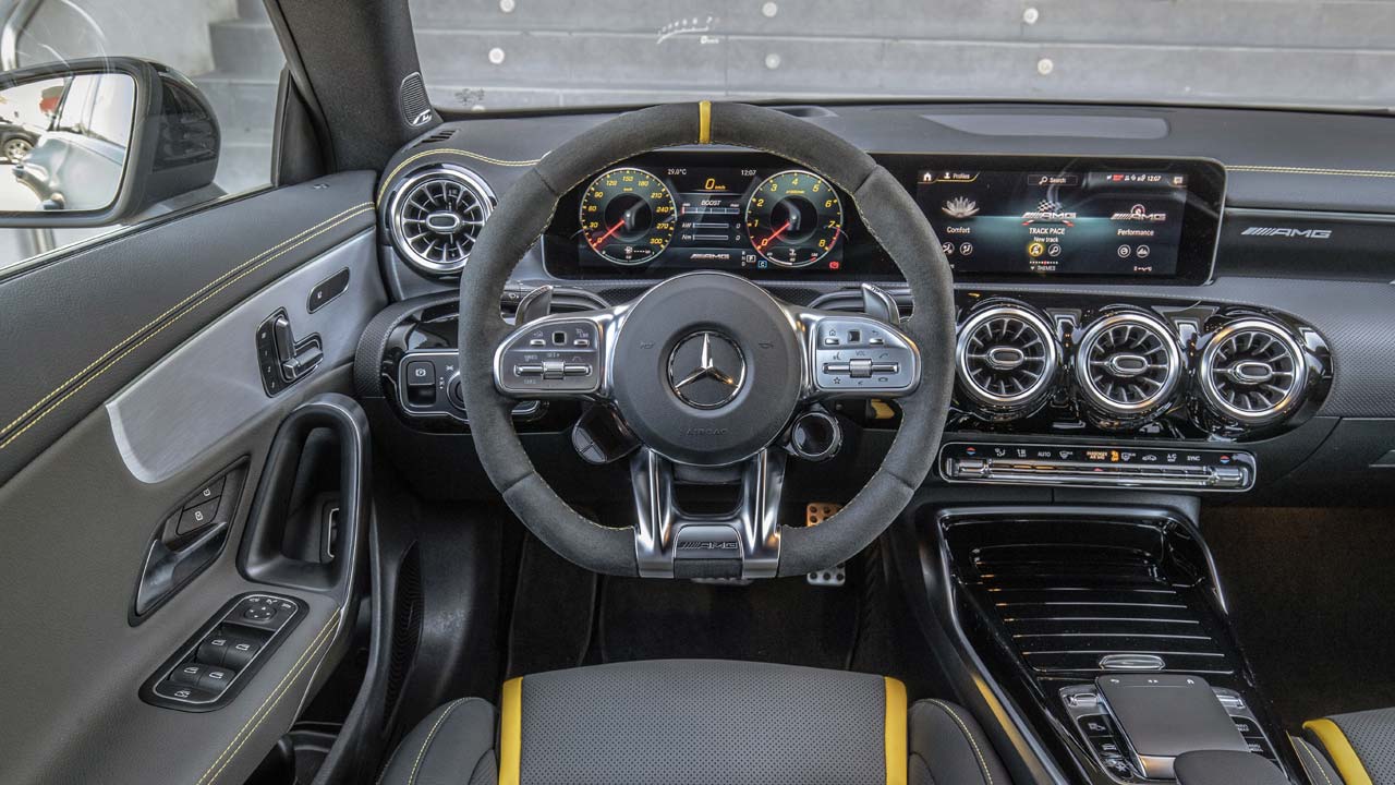 Για επιτάχυνση από στάση μέχρι τα πρώτα 100 χλμ. χρειάζεται μόλις 4’’ ενώ η τελική ταχύτητα φτάνει τα 270 χλμ./ώρα. Πρόκειται για τον δυνατότερο δίλιτρο κινητήρα παραγωγής, με υποδειγματική λειτουργία ακόμα και στις χαμηλές στροφές καθώς δεν παρουσιάζει τη συνηθισμένη υστέρηση. Η εξελιγμένη τετρακίνηση 4MATIC+ κατανέμει την κίνηση σε κάθε τροχό ανάλογα με την πρόσφυση «διαβάζοντας» συνεχώς τις συνθήκες του οδοστρώματος. Το κιβώτιο ταχυτήτων AMG Speedshift DCT-8G διπλού συμπλέκτη, προσφέρει άμεσες αλλαγές, ενώ υπάρχει και η δυνατότητα χειροκίνητης λειτουργίας με αλλαγές από τα paddles που βρίσκονται πίσω από το τιμόνι.
