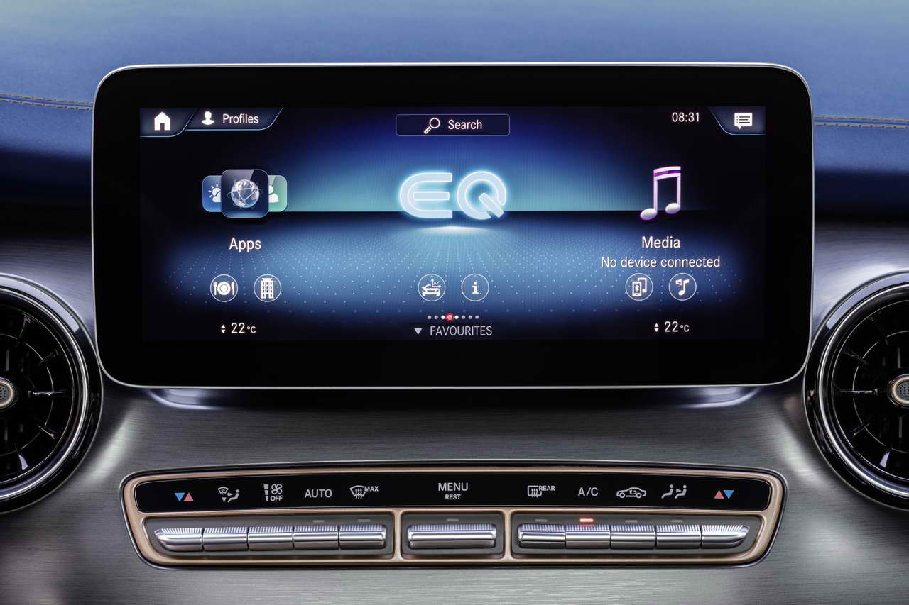 Αρκετές είναι και οι εξεζητημένες τεχνολογικές δυνατότητες του Mercedes-Benz EQV. Στο κέντρο του ταμπλό βρίσκεται μια οθόνη αφής 10 ιντσών, η οποία χάρη στο σύστημα MBUX (Mercedes-Benz User Experience) λειτουργεί και με φωνητικές εντολές σε φυσική γλώσσα. Ακόμη, το πρώτο ηλεκτρικό MPV της Mercedes-Benz έχει τη δυνατότητα φόρτισης εν κινήσει, μέσω ανάκτησης ενέργειας. Μάλιστα, ο οδηγός έχει τη δυνατότητα να επηρεάζει το βαθμό ανάκτησης ενέργειας, ανάλογα με την επιθυμία του. Σε αυτή τη διαδικασία βοηθά και το αυτόματα ενεργοποιημένο “ECO Assistant”, που μπορεί να ρυθμίσει μόνο του το βαθμό ανάκτησης ενέργειας ανά πάσα στιγμή. Αυτό επιτυγχάνεται μέσω εξέτασης δεδομένων πλοήγησης ή πληροφοριών που λαμβάνει από τις κάμερες και τα ραντάρ του αυτοκινήτου, σε πραγματικό χρόνο.