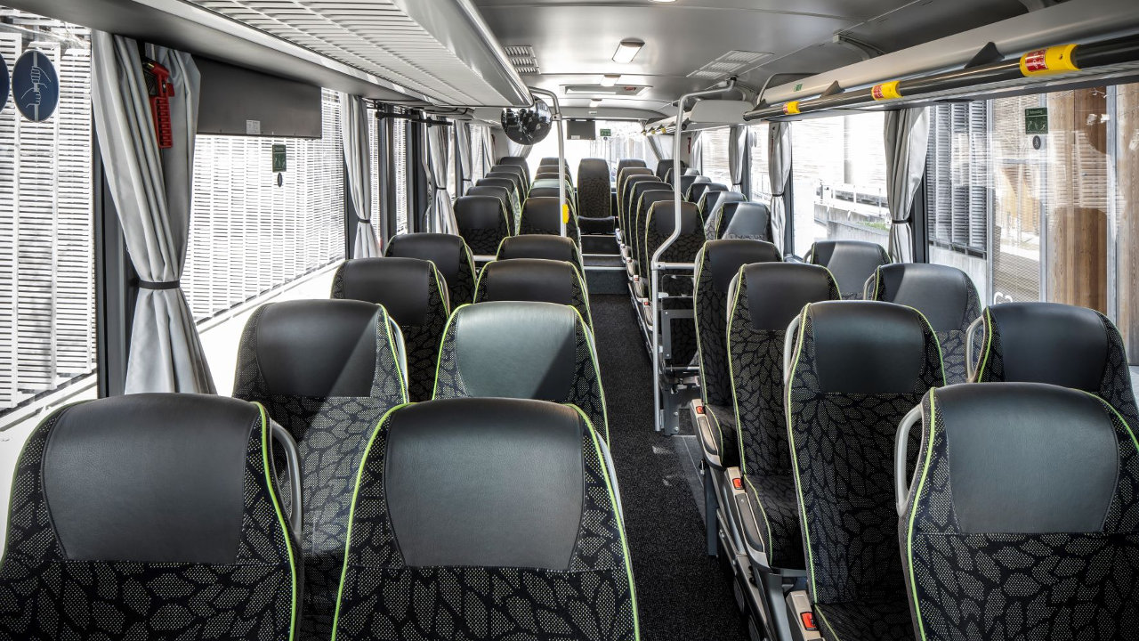 Τα αναπαυτικά καθίσματα Travel Star Eco με ρυθμιζόμενες πλάτες, έδρες και πλάτες καθισμάτων με καλύμματα σε Tiffy Gray, και προσκέφαλα σε Jet Black κατασκευασμένα από υλικό με ίνες τεχνητού δέρματος προσφέρουν κορυφαία άνεση ακόμη και σε μακρινές διαδρομές. Οι κουρτίνες των παραθύρων, η μαλακή επένδυση των πλευρικών τοιχωμάτων και το γκρίζο δάπεδο δημιουργούν μια ευχάριστη ατμόσφαιρα στο εσωτερικό.