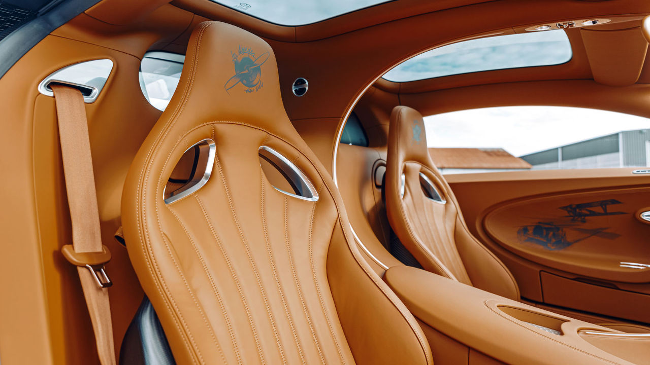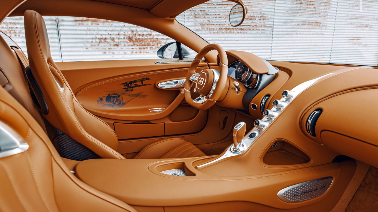 Η πάντα εντυπωσιακή καμπίνα της Chiron έχει ντυθεί για την περίσταση σχεδόν εξολοκλήρου με ανοιχτό καφέ δέρμα και είναι διακοσμημένη με λεπτομέρειες απο αλουμίνιο που έχουν κοπεί με διαμάντι αλλά και χειροποίητα γραφικά στα προσκέφαλα και φυσικά την απαραίτητο “ταμπελάκι” που υποδηλώνει το περιορισμένο της παραγωγής.