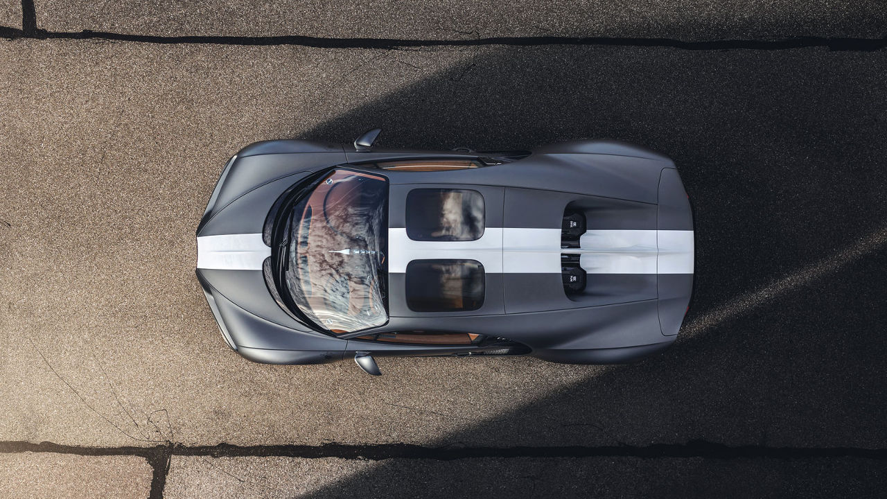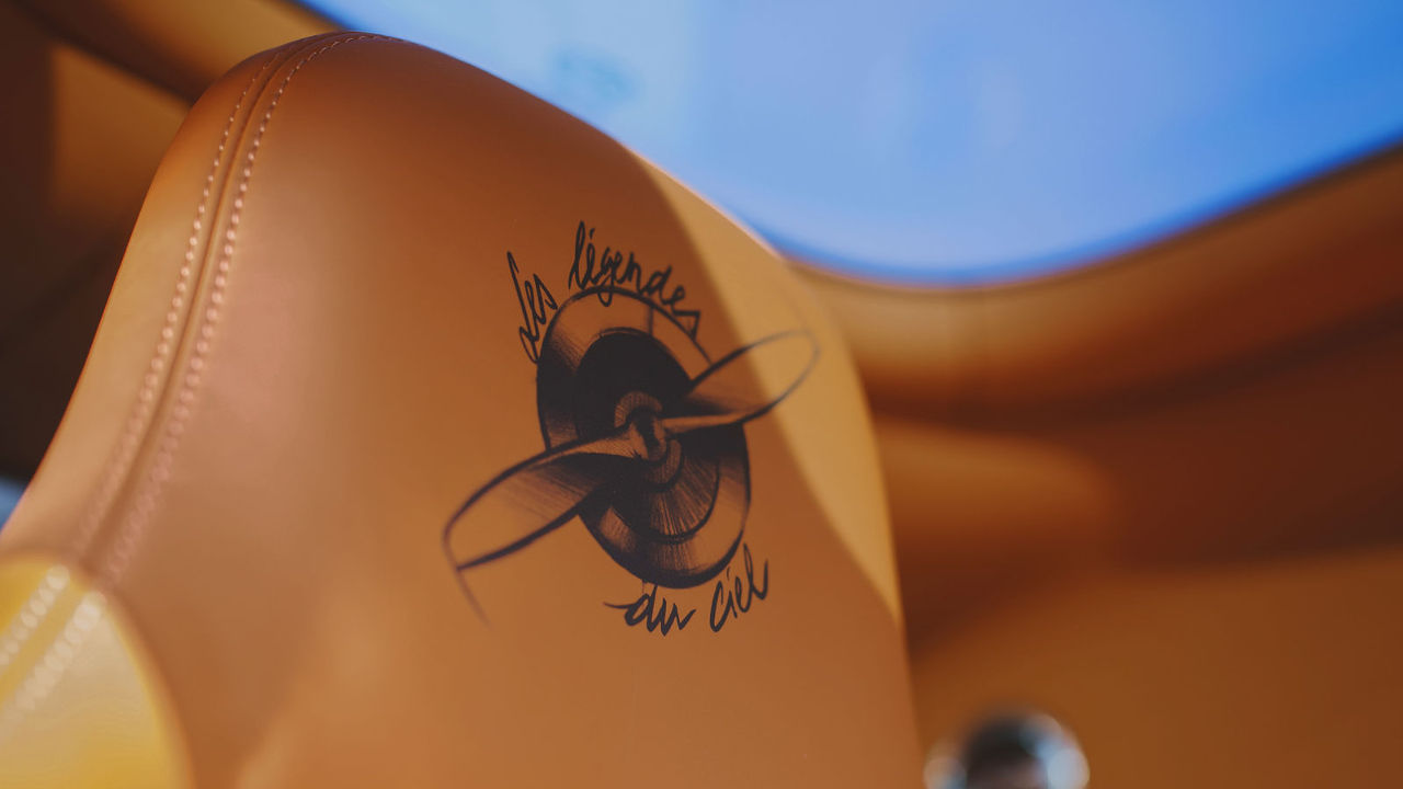 Το σκούρο γκρι ματ χρώμα που βλέπετε στις φωτογραφίες, με την πλατιά λευκή λωρίδα να διατρέχει κεντρικά όλη τη Chiron Sport, προορίζεται αποκλειστικά για τη νέα “ουράνια” έκδοση και είναι παρόμοιο με εκείνο που χρησιμοποιούνται στα αεροπλάνα της 10ετίας του ’20 του προηγούμενου αιώνα. Στα εμπρός φτερά βλέπουμε χειροποίητα γραφικά που θυμίζουν άμεσα το εμπρός μέρος εκείνων των αεροπλάνων, ενώ το εμπρός μέρος των μαρσπιέ είναι βαμμένο στα χρώματα της γαλλικής σημαίας. Η σήματα κατατεθέν γρίλια της Chiron έχει μαύρο γυαλιστερό φινίρισμα και έχει κατασκευαστεί από αλουμίνιο κομμένο με lazer. Παράλληλα το κάλυμμα του πανίσχυρου 16κύλινδρου είναι κατασκευασμένο από ανθρακονήματα, ενώ οι απολήξεις της εξάτμισης είναι μαύρες ματ και έχουν φτιαχτεί από τρισδιάστατα εκτυπωμένο Inconel.
