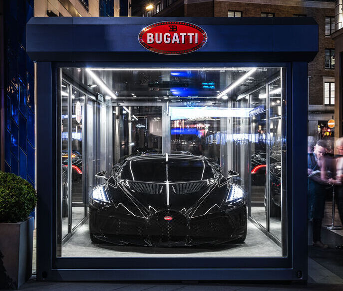 Μέχρι την 1η Δεκεμβρίου, η Bugatti «La Voiture Noire» δέσποζε σε ένα φωτιζόμενο γυάλινο κουτί στην πλατεία Λέστερ, στο Λονδίνο.