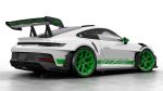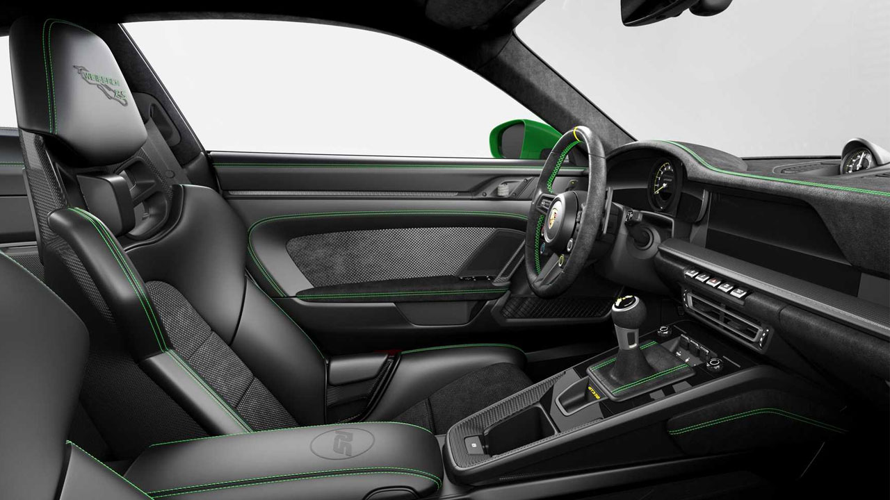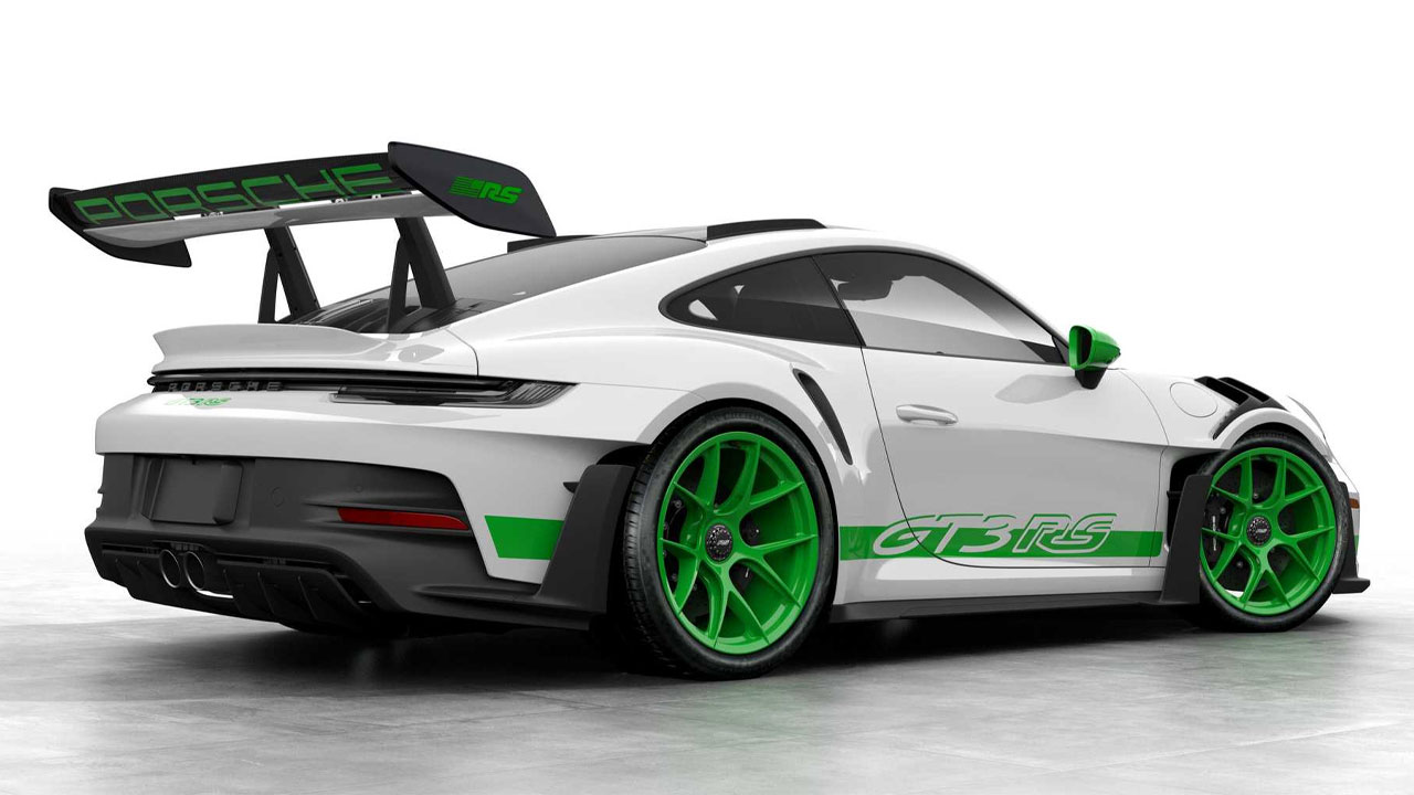 Ξεκινώντας από την εμφάνιση, η ιδιαίτερη 911 GT3 RS ενσωματώνει το πακέτο Weissach, με τις πράσινες λεπτομέρειες στο αμάξωμα που η Porsche ονομάζει Python Green. Σε αυτή την απόχρωση είναι βαμμένα και τα καλύμματα των καθρεπτών, αλλά και οι ζάντες μαγνησίου. Μια εντυπωσιακή λεπτομέρεια συναντάμε στην πίσω εμφατική πτέρυγα, όπου συναντάμε το έμβλημα RS και τη σημαία των Ηνωμένων Πολιτειών. Φυσικά σε Python Green απόχρωση.