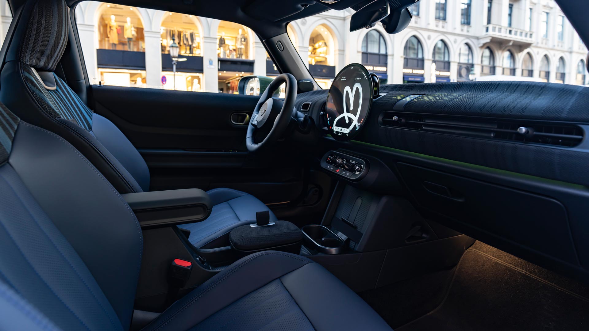Ένα ακόμα δημιουργικό στοιχείο στο εσωτερικό είναι το υφασμάτινο ένθετο στην κάθετη ακτίνα του τιμονιού, με τις χαρακτηριστικές ρίγες του Paul Smith – υπογραμμίζοντας το αδιαμφισβήτητο στυλ του Βρετανού σχεδιαστή. Ένα χειρόγραφο γραφικό με το χαρακτηριστικό «κουνελάκι» του κοσμεί το πατάκι, αναδεικνύοντας το χιούμορ του Paul Smith και ολοκληρώνοντας με στιλ το design της καμπίνας.