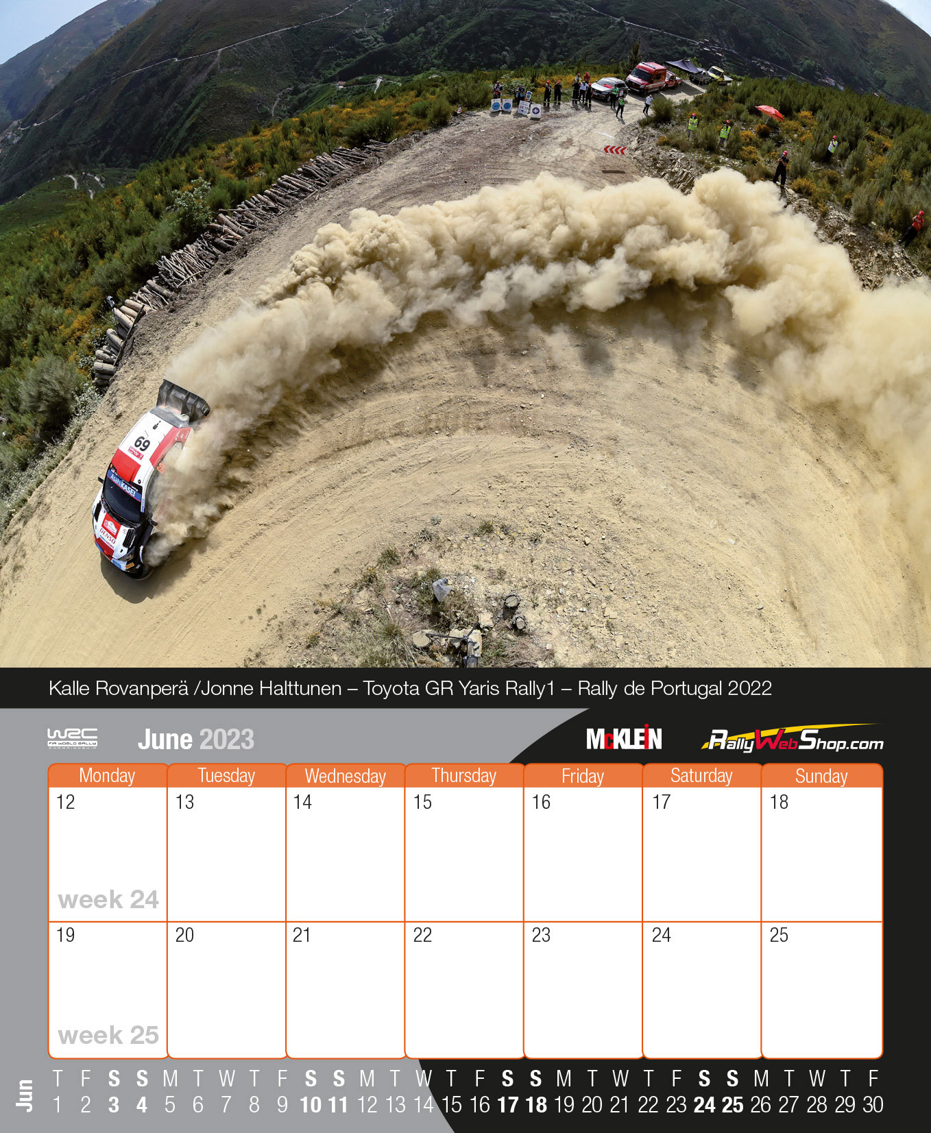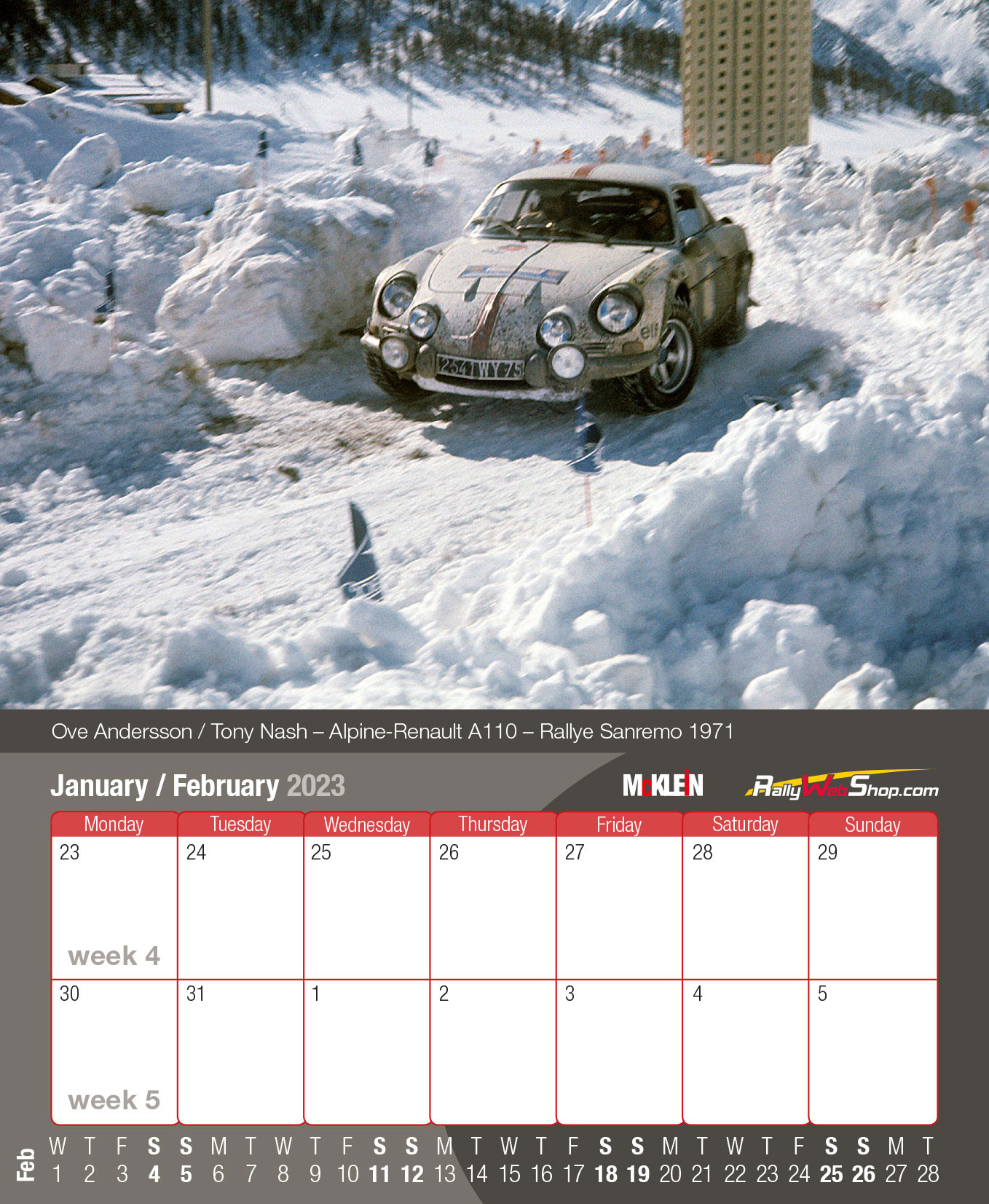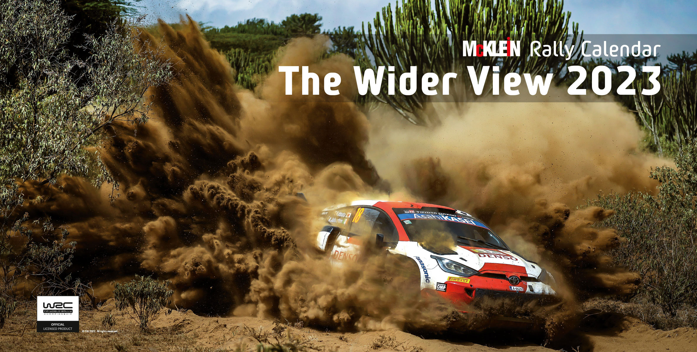 Σχεδόν ένα μέτρο πλάτος, εντυπωσιακά τυπωμένο και με εξαιρετικές φωτογραφίες: το επίσημο ημερολόγιο τοίχου του Παγκόσμιου Πρωταθλήματος Ράλι της FIA παραμένει το μεγαλύτερο του τύπου του. Αυτό το τεράστιο πανοραμικό ημερολόγιο «McKlein Rally 2023 – The Wider View» δείχνει ξανά τη γοητεία του ράλι από ασυνήθιστες προοπτικές και παρουσιάζει τις καλύτερες φωτογραφικές τεχνικές.