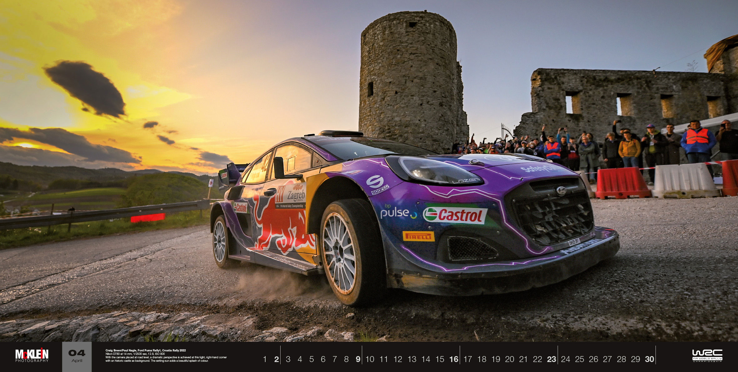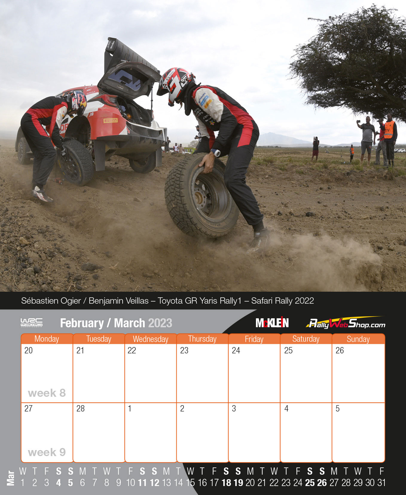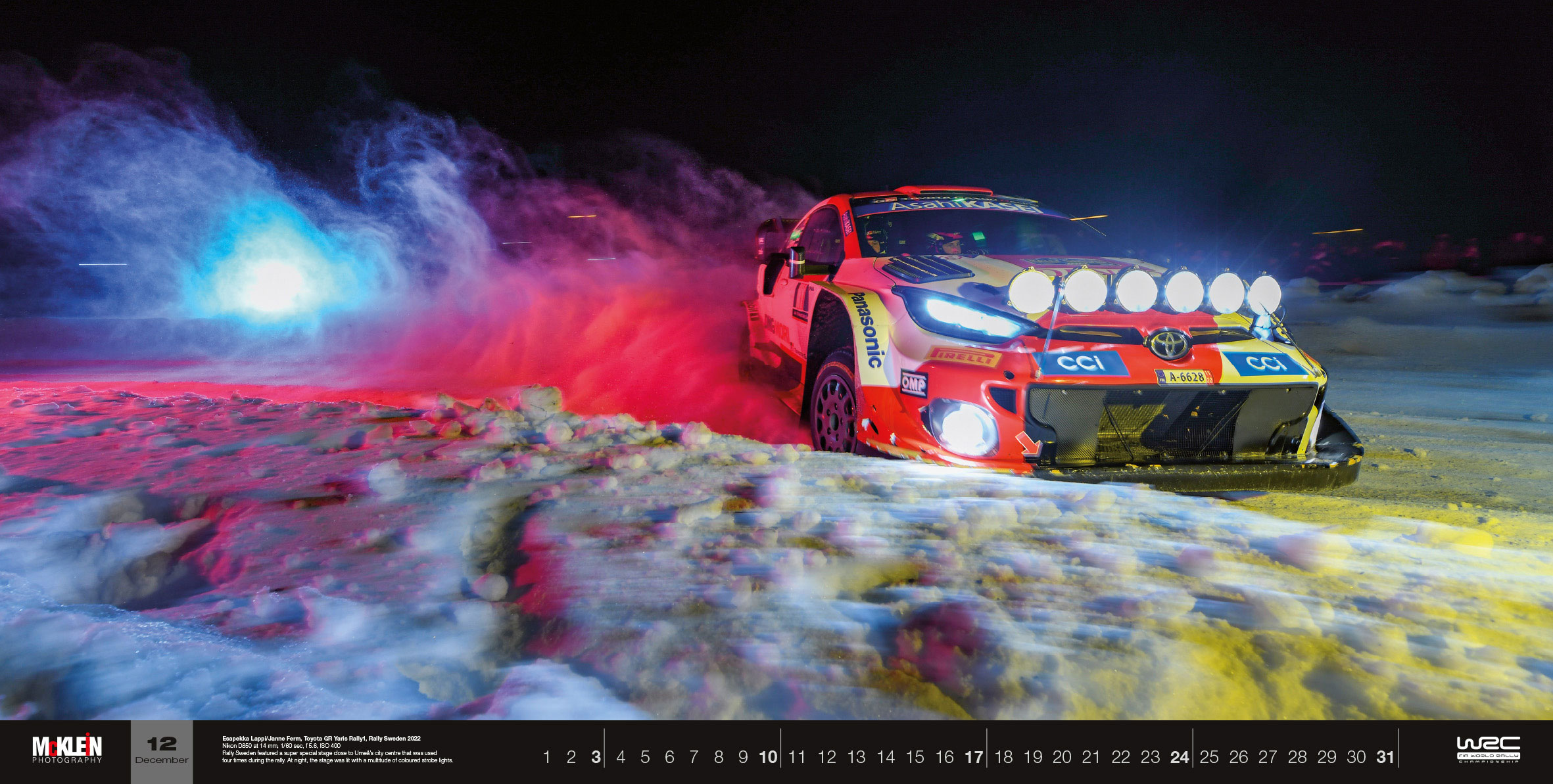 Σχεδόν ένα μέτρο πλάτος, εντυπωσιακά τυπωμένο και με εξαιρετικές φωτογραφίες: το επίσημο ημερολόγιο τοίχου του Παγκόσμιου Πρωταθλήματος Ράλι της FIA παραμένει το μεγαλύτερο του τύπου του. Αυτό το τεράστιο πανοραμικό ημερολόγιο «McKlein Rally 2023 – The Wider View» δείχνει ξανά τη γοητεία του ράλι από ασυνήθιστες προοπτικές και παρουσιάζει τις καλύτερες φωτογραφικές τεχνικές.