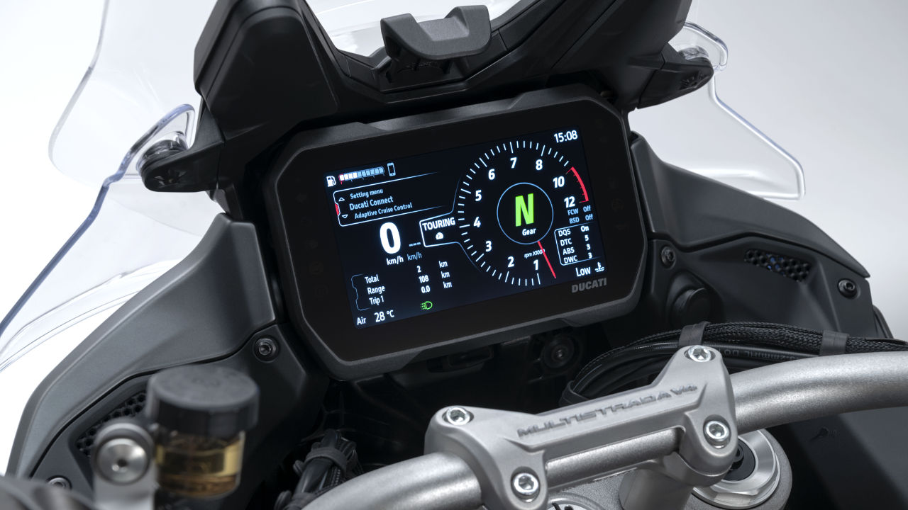 Ο οδηγός “επικοινωνεί” με τη Multistrada V4 μεσώ ενός νέου TFT πίνακα πληροφοριών με διαγώνιο στις 6,5 ίντσες (πέντε ίντσες στη στάνταρ έκδοση). Από τη μεσαία έκδοση και μετά ο αναβάτης έχει στη διάθεση του και joystick στο αριστερό γκριπ για ευκολότερη πρόσβαση σε μενού και λειτουργίες, ενώ διαθέσιμο είναι και το νέο Ducati Connect που επιτρέπει τη σύνδεση, τον έλεγχο του κινητού του αλλά και την παρουσίαση δεδομένων στον πίνακα πληροφοριών. Το κινητό μπορεί να τοποθετηθεί σε μικρό ντουλαπάκι στο πάνω μέρος του ρεζερβουάρ όπου υπάρχει και θύρα USB για τη φόρτιση του.