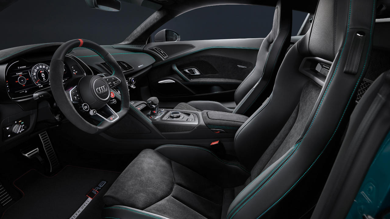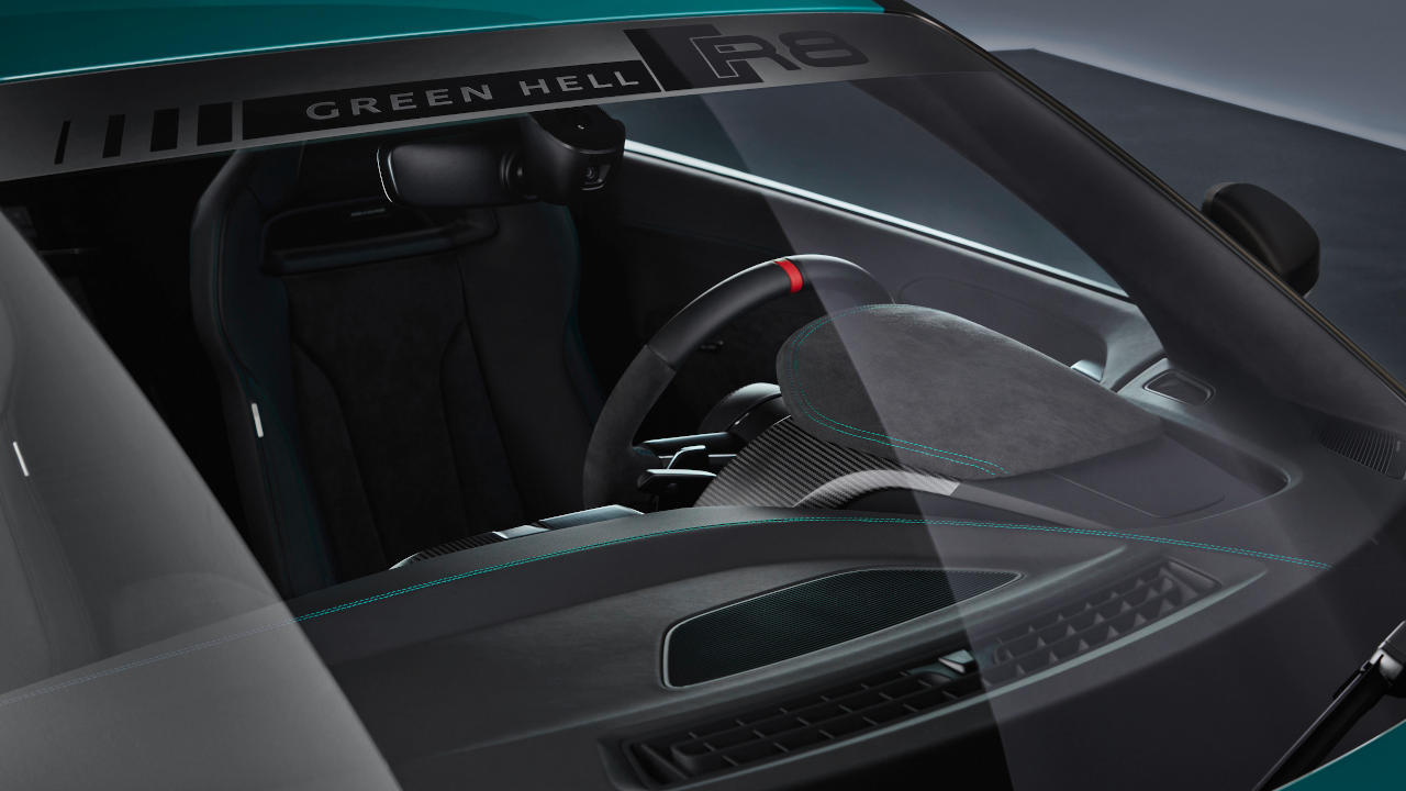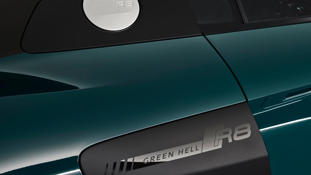 Οι πόρτες των R8 green hell θα φέρουν τον αύξοντα αριθμό αυτής της έκδοσης με γραφικά που θα τα κάνουν να θυμίζουν τα νούμερα των αγωνιστικών αυτοκινήτων αντοχής. Παράλληλα το λογότυπο “GREEN HELL R8” κάνει την εμφάνιση του στα μαρσπιέ αλλά και στο παρμπρίζ, ενώ μαύρες λεπτομέρειες βλέπουμε στο εμπρός μέρος, στην πίσω αεροτομή και διαχύτη, στα καλύμματα των καθρεπτών, στις ποδιές και το εμπρός μέρος. Σε μαύρο χρώμα με κόκκινες λεπτομέρειες είναι και οι ζάντες των 20 ιντσών.