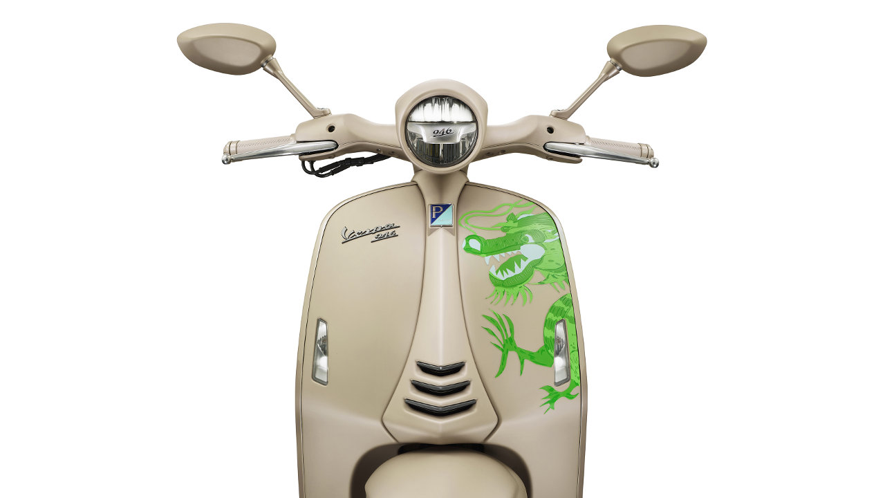 Η Vespa 946 φέρει αποκλειστικό χρυσό χρώμα για τη συλλεκτική έκδοση Dragon και θα είναι διαθέσιμη σε 1.888 αντίτυπα. Αυτό που την κάνει να ξεχωρίζει είναι η διακόσμηση με το εντυπωσιακό γραφικό ενός σμαραγδένιου πράσινου δράκου που έρπει πάνω στις μεταλλικές επιφάνειες της 946 θυμίζοντας έντονα αερογραφία.