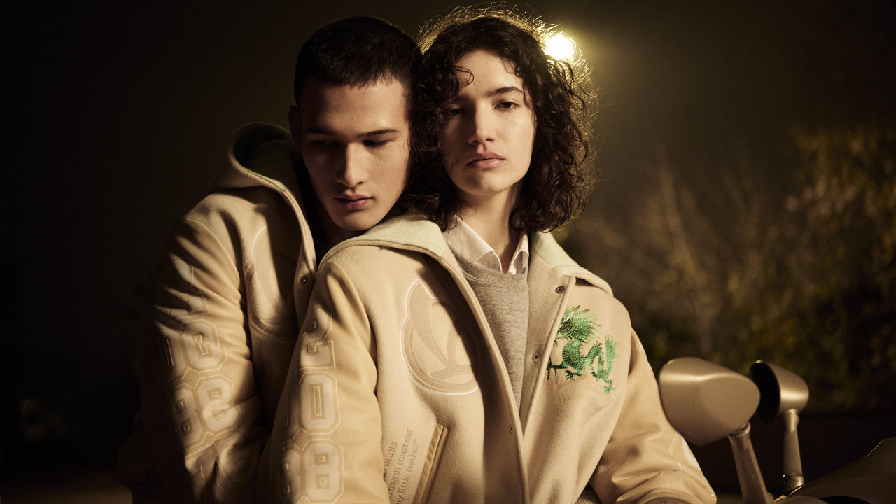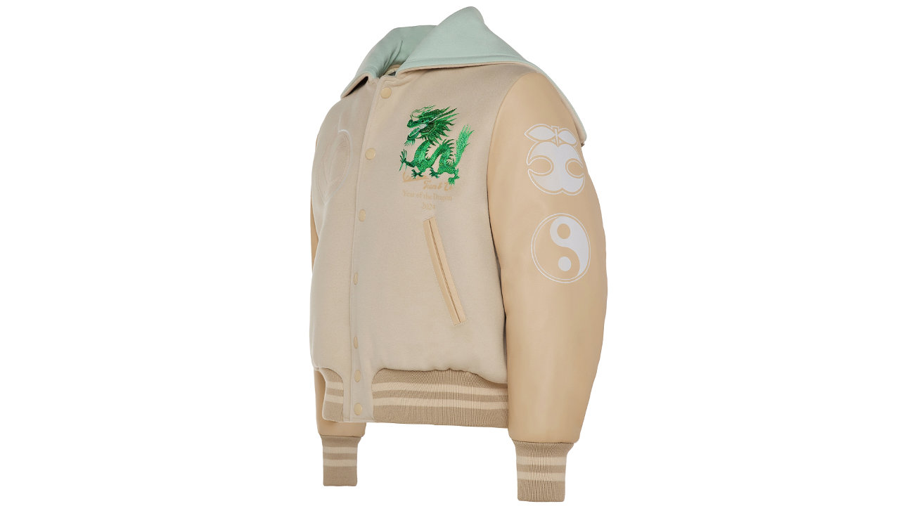 Αντλώντας έμπνευση από το σχέδιο της Vespa 946 Dragon, το varsity jacket από ραβδωτό μαλλί με μαλακά μανίκια από δέρμα νάπα επανερμηνεύει το σχέδιο του δράκου με τη μορφή εκτυπώσεων και κεντημάτων που πρωταγωνιστούν στην πλάτη και την αριστερή τσέπη. Το μπροστινό μέρος του μπουφάν φέρει το εμβληματικό μονόγραμμα V της Vespa, συνοδευόμενο από μια αρχαία κινεζική παροιμία.