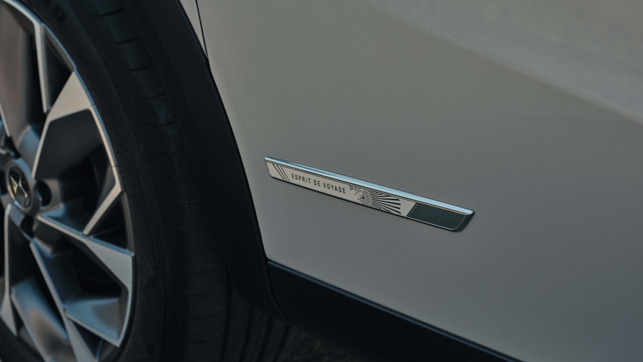 Εξωτερικά, η υπογραφή Esprit de Voyage είναι διακριτή στις μπροστινές πόρτες, ενώ και τα περιβλήματα των καθρεπτών έχουν ένα ειδικό σχέδιο χαραγμένο με λέιζερ, προσαρμοσμένο για να υποδηλώνει την κίνηση και την αεροδυναμική που συμβολίζει το ταξίδι. Στο μπροστινό μέρος, η μάσκα, με τα DS Wings και την αντίστοιχη γρίλια σε Gloss Black, ξεχωρίζει από χρωμιωμένες ψηφίδες.