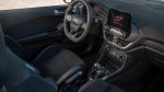 Στο εσωτερικό βλέπουμε το σπορ τιμόνι που προέρχεται από τη Ford Performance και φέρει κουμπί που ενεργοποιεί τη λειτουργία Sport. βλέπουμε επίσης και λεπτομέρειες και φιλέτα με carbon look εμφάνιση, μπλε ραφές για τα καθίσματα και λοιπές επενδύσεις.