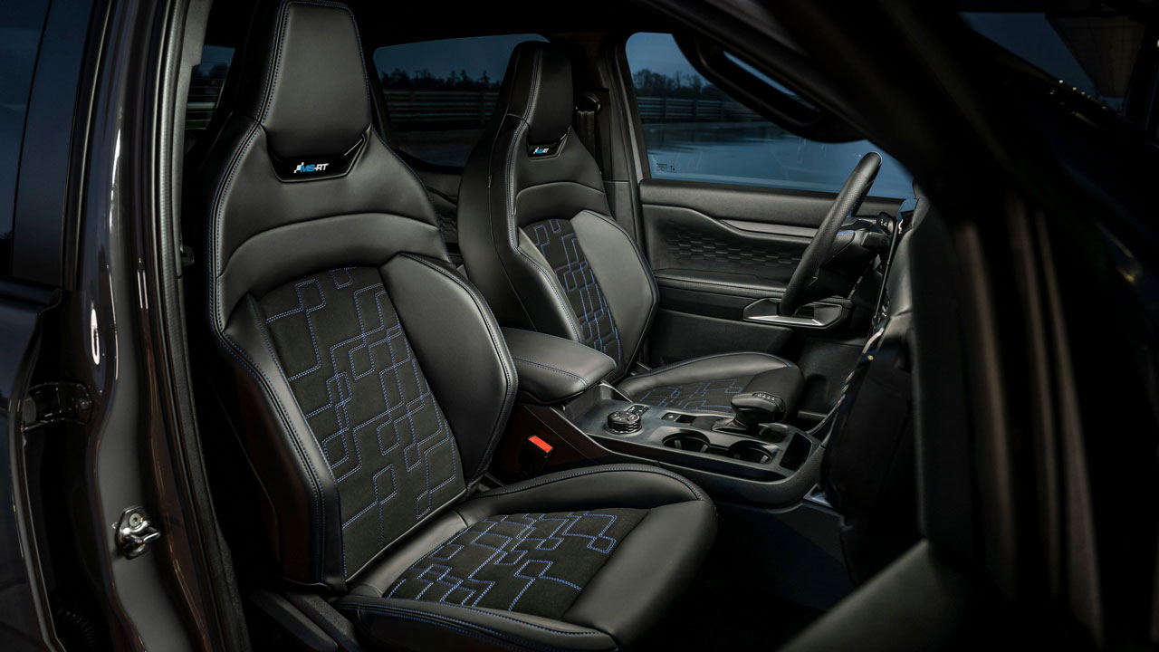 Το χαρακτηριστικό εσωτερικό του διπλοκάμπινου μοντέλου διαθέτει μοναδικά νέα καθίσματα με σπορ σχεδίαση που παρέχουν βελτιωμένη άνεση και υποστηρίζουν καλύτερα τo σώμα των εμπρός επιβατών. Το μη ζωϊκό οικολογικό δέρμα και το σουέντ, σε συνδυασμό με το διακριτικό μοτίβο διακόσμησης MS-RT και τις χαρακτηριστικές μπλε ραφές, κοσμούν τόσο τα εμπρός όσο και τα πίσω καθίσματα. Λογότυπα MS-RT υπάρχουν στο εμπρός μέρος των καθισμάτων καθώς και ένα πρόσθετο σήμα στο ταμπλό. Το σπορ τιμόνι είναι θερμαινόμενο, φέρει μπλε σήμανση για τη θέση της ευθείας και ένθετο με λογότυπο MS-RT.