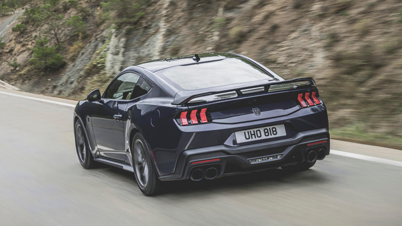 Οι χαμηλότερες πλαϊνές ποδιές, η σταθερή πίσω αεροτομή, ο αγωνιστικής έμπνευσης διαχύτης και οι σκουρόχρωμες τετραπλές απολήξεις της εξάτμισης συμπληρώνουν την εικόνα της Dark Horse, ενώ τα παραδοσιακά σήματα “Mustang” αντικαθίστανται από το λογότυπο “Mustang Dark Horse” στους εμπρός θόλους των τροχών, την πίσω πόρτα και τα μαρσπιέ των θυρών. Επίσης, κάθε αυτοκίνητο διαθέτει ένα μοναδικό σήμα με τον αριθμό παραγωγής, ενώ αποκλειστική είναι και η μεταλλική εξωτερική βαφή Blue Ember.