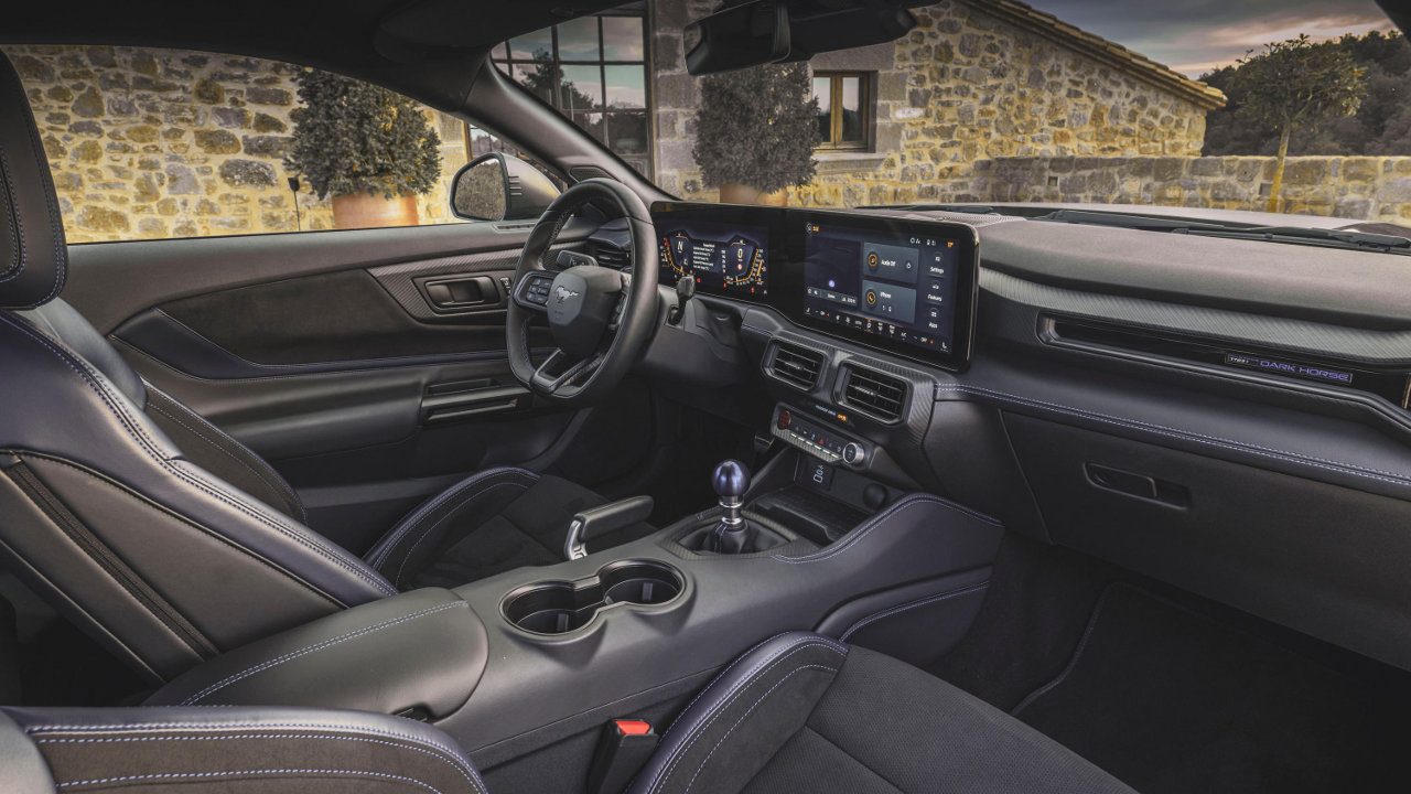 Οι πλήρως προσαρμόσιμες ενδείξεις του ψηφιακού συμπλέγματος που δημιουργούν οι οθόνες, καθώς και ο εσωτερικός φωτισμός της Mustang, χαρακτηρίζονται από τα σκούρα χρώματα και τις χάλκινες αποχρώσεις τους – με θέματα παρόμοια με αυτά της ηλεκτρικής Mustang Mach-E.