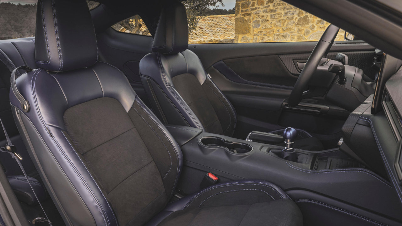 Στο εσωτερικό, η Mustang έβδομης γενιάς φέρει ένα τεχνολογικά προηγμένο, οδηγοκεντρικό cockpit.Το άνω τμήμα του ταμπλό χαρακτηρίζεται από τη ρέουσα και πιο “ανοιχτή” διάταξη με επένδυση από γυαλί, προσφέροντας ένα πιο καθαρό και ελκυστικό περιβάλλον.