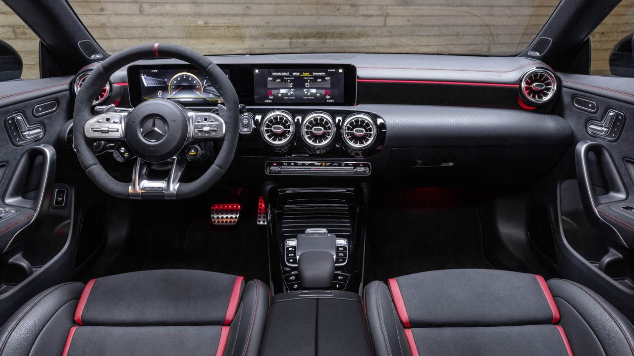 Όσον αφορά την καμπίνα της Mercedes-AMG CLA 45 4MATIC+ Shooting Brake, αυτή ξεχωρίζει για την ποιότητα κατασκευής της και την κορυφαία λέξη της τεχνολογίας με την οποία εξοπλίζεται. Φυσικά, τα καθίσματα, το τιμόνι και οι κόκκινες λεπτομέρειες φροντίζουν ώστε να αναδείξουν τον δυναμισμό του εσωτερικού, ενώ το γνωστό πλέον σύστημα MBUX με τις δύο οθόνες, βρίσκεται σε περίοπτη θέση και προσφέρει επικοινωνία οδηγού αυτοκινήτου με φωνητικές εντολές. Φυσικά ο πίνακας οργάνων είναι ψηφιακός, ενώ διαθέτει ειδικά γραφικά για την έκδοση AMG.