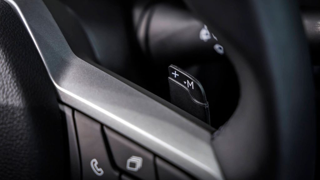 H οδηγική άνεση ενισχύεται χάρη στο νέο κιβώτιο E-Shifter – με τα εύχρηστα χειριστήρια αλλαγής σχέσεων στο τιμόνι (έκδοση Eco-G 120 EDC).