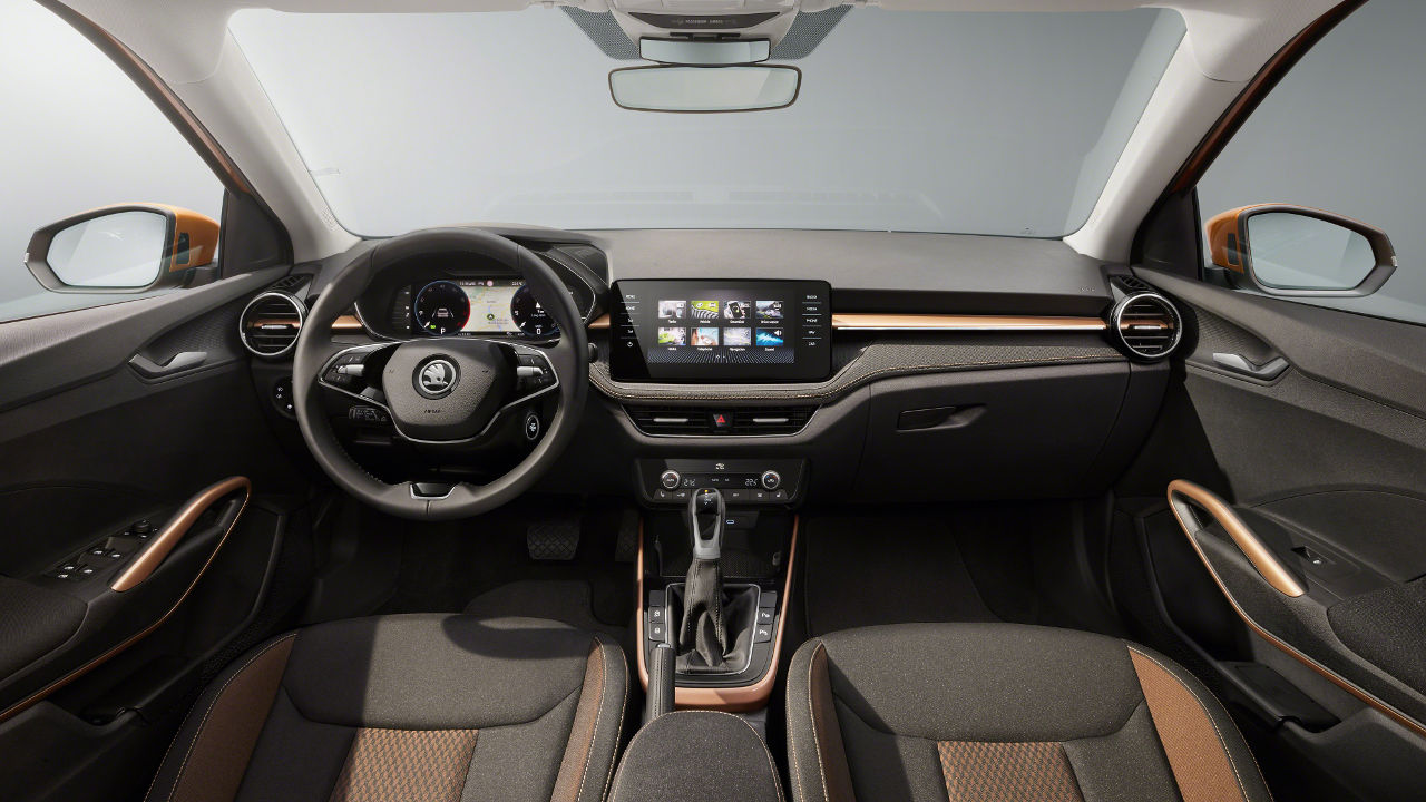 Στην καμπίνα, η μοντέρνα εικόνα που παρουσιάζει η σχεδίαση του αμαξώματος της νέας Fabia, συνεχίζεται. Το ταμπλό χαρακτηρίζεται από καθαρές γραμμές και συμμετρικότητα. Ο οδηγός έχει μπροστά του αναλογικά όργανα και μια οθόνη πληροφοριών στις 3,5 ίντσες, ενώ προαιρετικά και για πρώτη φορά για Fabia, μπορεί να τοποθετήσει πλήρως ψηφιακό πίνακα πληροφοριών με διαγώνιο στις 10,25 ίντσες. Από την άλλη η κεντρικά τοποθετημένη οθόνη του multimedia συστήματος μπορεί να φτάσει έως τις 9,2 ίντσες-6,5 και 8 ίντσες οι άλλες επιλογές.