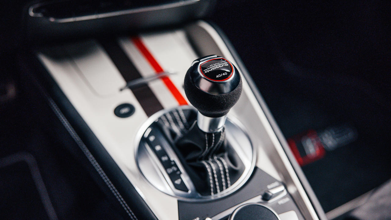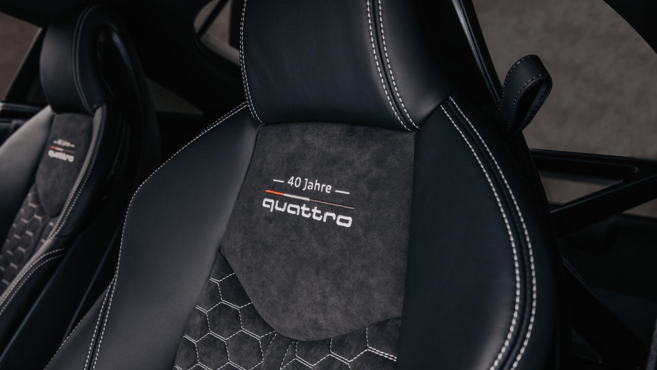 Ανάλογες λεπτομέρειες βλέπουμε και στο εσωτερικό με τις λευκές ραφές και τις επενδύσεις να είναι είτε από alcantara είτε από μαύρο δέρμα και τις λευκές τους ραφές να δημιουργούν την απαραίτητη αντίθεση. Για τα καθίσματα έχει επιλεχθεί ο συνδυασμός δέρματος Nappa και alcantara για τα πλαϊνά, ενώ ψηλά στις πλάτες βλέπουμε και το “40 χρόνια quattro”. Έτσι για να μην ξεχνιόμαστε… Τέλος στον επιλογέα κάθε TT RS 40 Jahre quattro, η Audi έχει ενσωματώσει και τον αύξοντα αριθμό του κάθε μοντέλου.