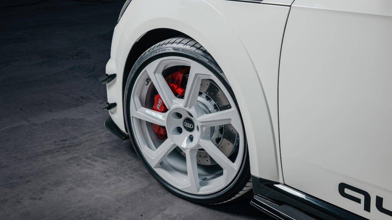 Το συλλεκτικό TT είναι βαμμένο σε αυτό το χαρακτηριστικό λευκό που αποκαλείται από την Audi “Alpine White”, ενώ στο ίδιο χρώμα είναι και οι ζάντες αλουμινίου των 20 ιντσών που κρύβουν πίσω τους διάτρητους δίσκους και κόκκινες δαγκάνες.