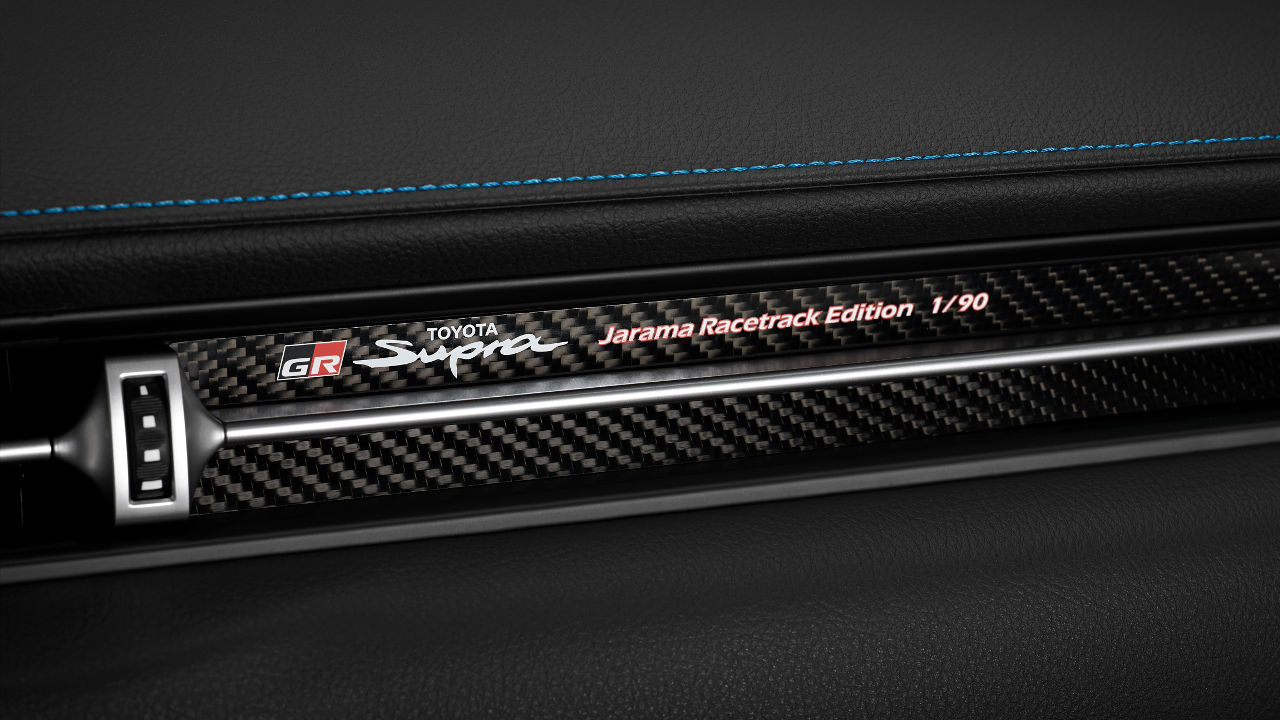 Το βαθύ μπλε χρώμα του αμαξώματος ονόματι Horizon Blue, οι ματ σφυρήλατες ζάντες αλουμινίου των 19 ιντσών και οι μαύρες επενδύσεις alcantara στο εσωτερικό, σε συνδυασμό με μπλε ραφές, είναι οι κύριες διαφοροποιήσεις αυτής της έκδοσης έναντι των υπολοίπων. Στο εσωτερικό βλέπουμε επίσης μπροστά από το συνοδηγό και ένα φιλέτο από ανθρακονήματα που φέρει και τον αύξοντα αριθμό για κάθεμια από τις 90 Jarama Racetrack Edition Supra που θα κατασκευαστούν.