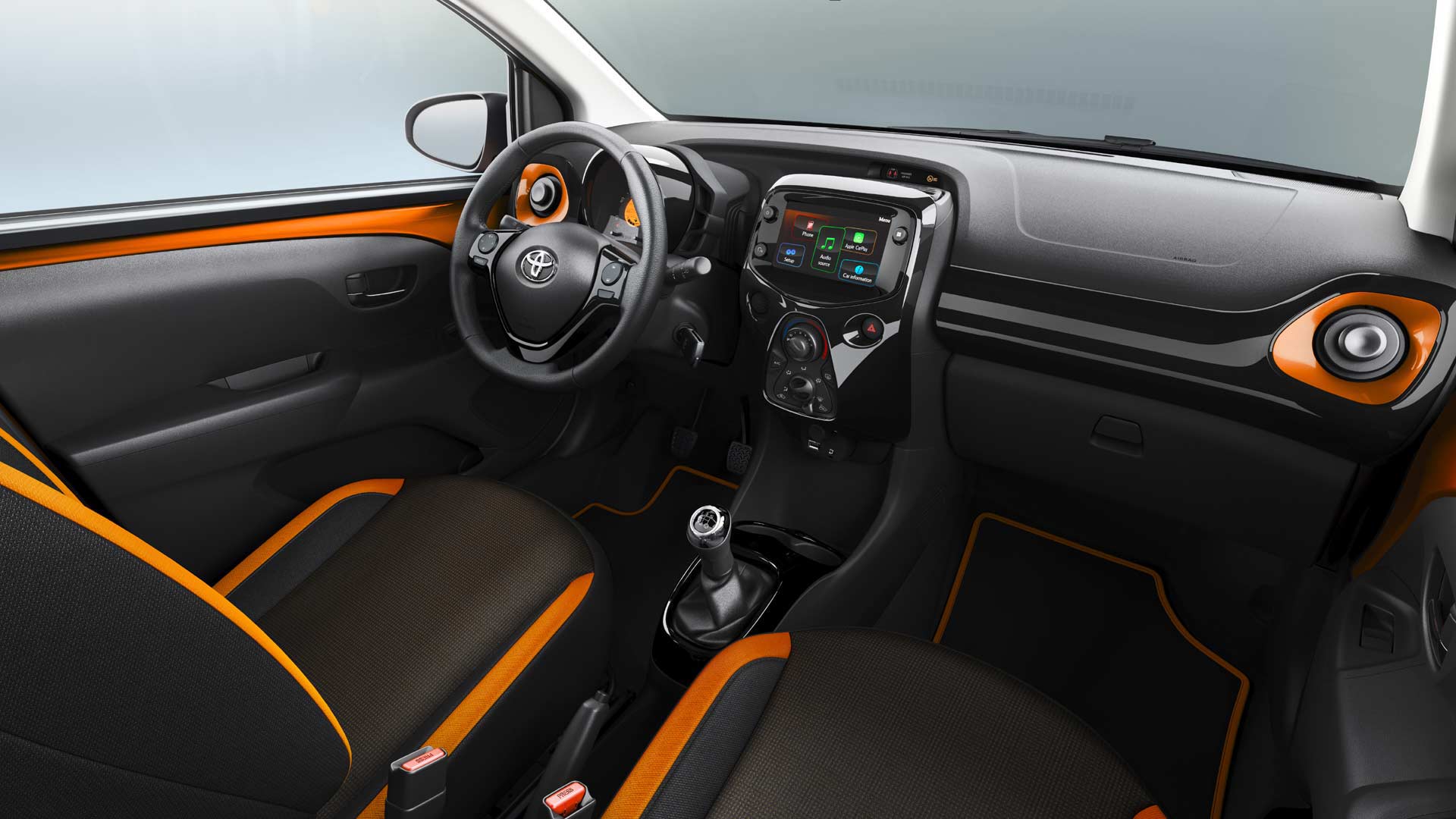Από την άλλη το Toyota Aygo x-cite έχει να επιδείξει πορτοκαλί αμάξωμα με μαύρη οροφή. Στο εσωτερικό του και αυτό έχει λεπτομέρειες ανάλογες με το χρώμα του αμαξώματος, ενώ τα καθίσματά του έχουν δίχρωμη επένδυση και τα πατάκια είναι νέου σχεδιασμού.