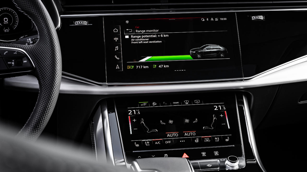 Το plug-in Audi Q8 55 60 TFSI e quattro φέρει τον γνωστό τρίλιτρο εξακύλινδρο TFSI κινητήρα των Γερμανών ο οποίος αποδίδει για την περίσταση 340 ίππους και 450 Nm ροπής. To θερμικό μοτέρ συνεργάζεται με ηλεκτρικό που αποδίδει 136 ίππους και δίνει τη δυνατότητα στο Q8 να κινηθεί και αμιγώς ηλεκτρικά χάρη στη συστοιχία μπαταριών του συστήματος των 17,8 kWh με ταχύτητες έως και 135/χλμ./ώρα. Για τη μπαταρία, με χρήση wallbox, ο χρόνος φόρτισης φτάνει περίπου στις 2,5 ώρες, ενώ η ηλεκτρική αυτονομία για το “55άρι” φτάνει στα 47 χλμ. κατά το πρότυπο WLTP και στα 45 χλμ. για το “60άρι”.